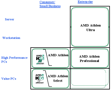 Продвижению его в профессиональный сегмент мешало отсутствие чипсетов для многопроцессорных систем (в отличии от подхода Intel, для Athlon требовалась выделенная шина для каждого из процессоров) и сложности с наращиванием объема и производительности кэша. Предназначенные для серверов Intel Pentium III Xeon с внешним полноскоростным кэшем стоили огромных по меркам рынка ПК денег, при этом ограничивались частотой 550 МГц. Частота же более доступных микросхем внешнего кэша, которые устанавливались в Athlon (да и в Pentium III Katmai), была и вовсе ограничена 350 МГц.