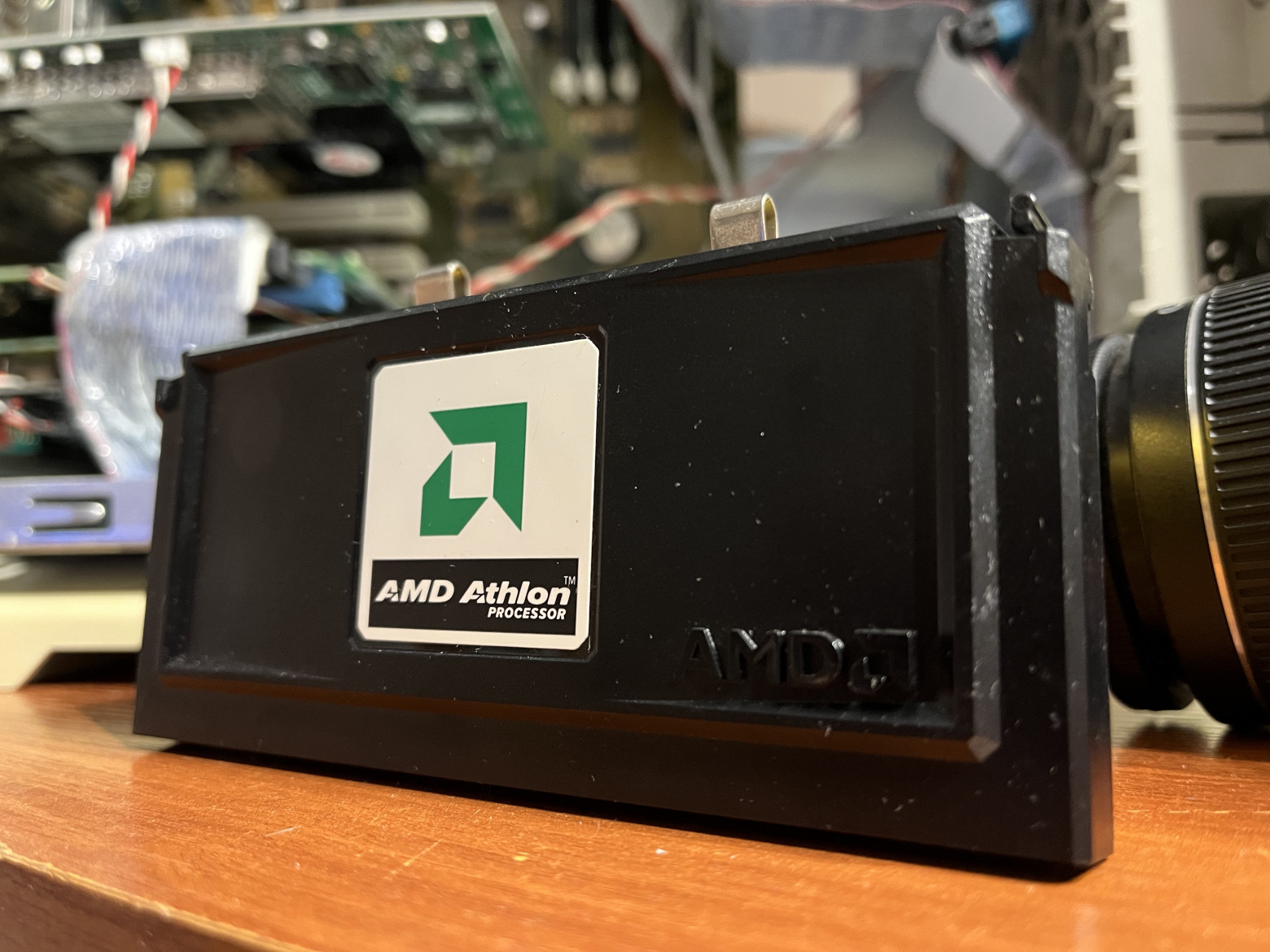 Внешних отличий было минимум: в глаза бросался только крупный двухцветный, тогда еще черно-зеленый, логотип на белом фоне в середине пластиковой части у изделия AMD (голографический логотип Intel был заметно меньше, а также крупная надпись на верхней грани картриджа). Что интересно, у части процессоров первых серий и надпись, и логотип гласили «AMD 7th Generation Processor», а имя Athlon нигде на устройстве не упоминалось! В таком исполнении мне встречались версии на 500 и 550 МГц. Инженерные образцы и вовсе маркировались как AMD K7.