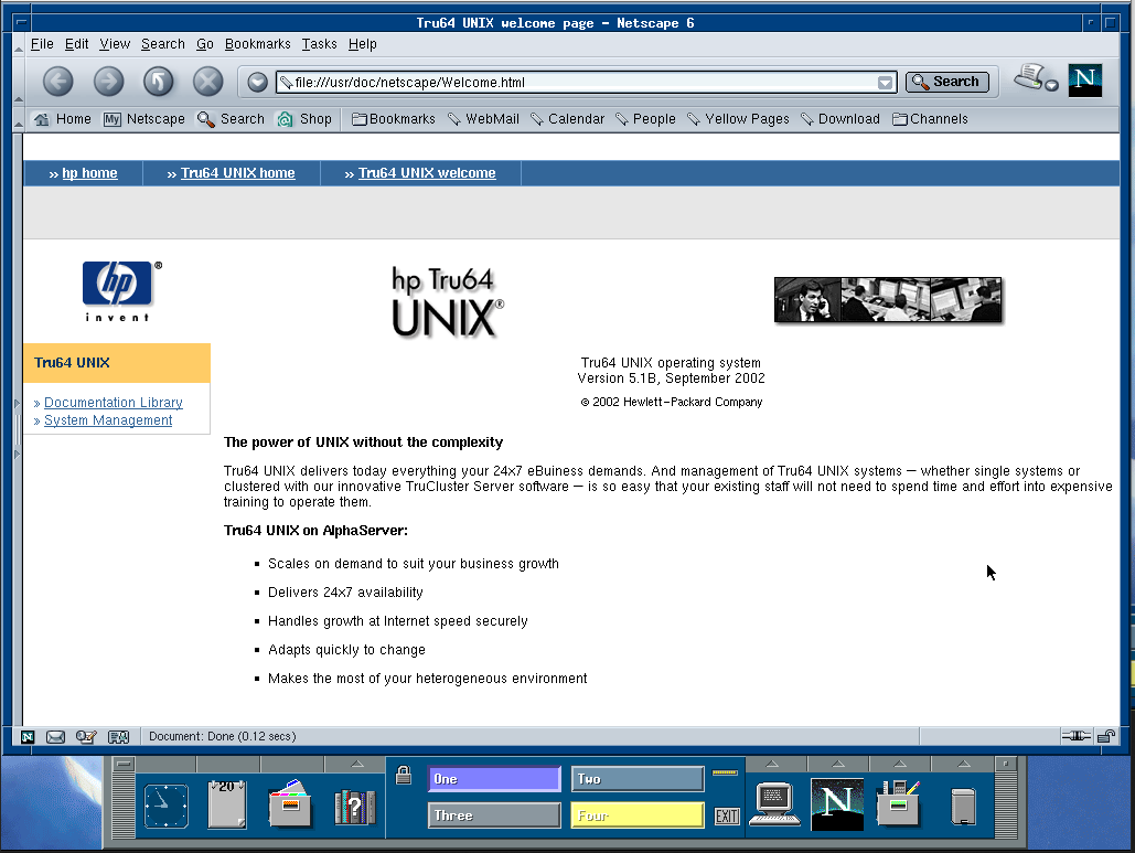 Первым делом, нас встречает классическая оболочка CDE. Бывшая прорывом в середине девяностых, в начале XXI века, она смотрится все еще приятно, но устаревание уже чувствуется. Набор ПО в комплекте небольшой, только самое необходимое — утилиты и браузер. По умолчанию установлен Netscape 4 и Netscape 6. Возможно установить Mozilla Firefox 1.5.