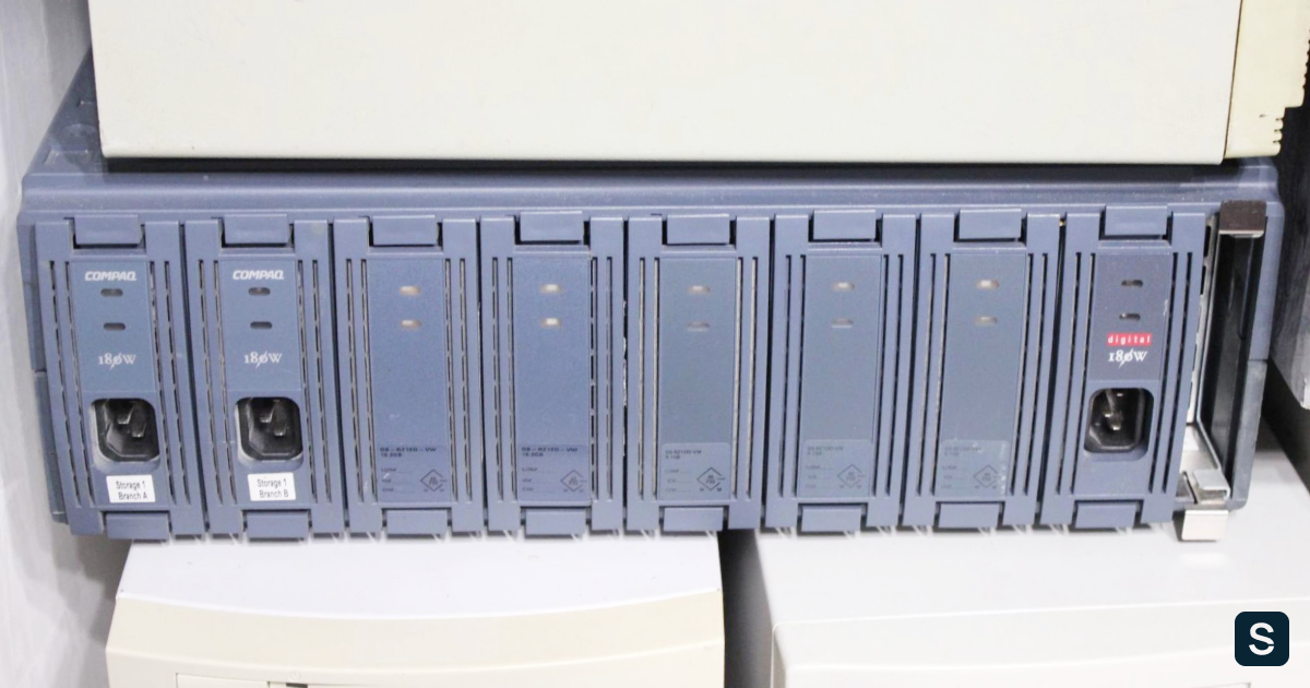 У контроллера есть и внешние разъемы, так что на второй канал можно повесить стример, ленточную библиотеку или дисковую полку. Из перечисленного в комплекте с машиной мне досталась оригинальная полка для SCSI дисков с несколькими 9 и 18 Гбайт накопителями. Она выполнена в том же цвете, что и сервер и отлично дополняет его. Полка довольно старой модели и выпускалась еще во времена Digital, о чем говорит тот факт, что один из блоков питания несет лого старой компании, а два — уже новой.