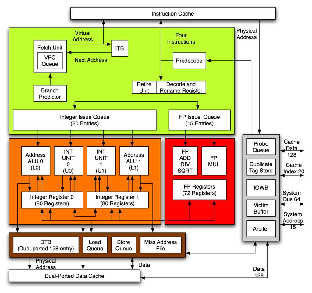 Как вы помните, Alpha всегда выделялась очень высокими для своего времени частотами. К концу двадцатого века, в результате гонки частот Intel и AMD и постепенного свертывания разработки архитектуры со стороны Compaq этот тренд прекратился. EV6 с частотой 466-600 МГц были не быстрее (речь только о частотах) предыдущего поколения.