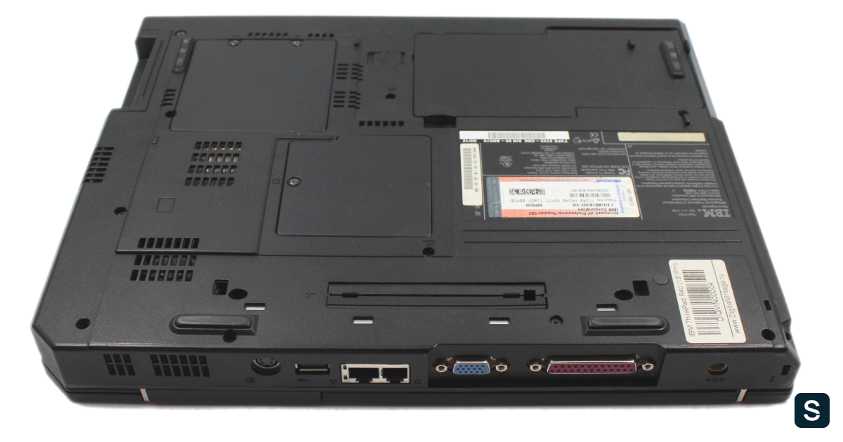 На дне корпуса все как обычно: два лючка для доступа к слоту для Wi-Fi адаптера и памяти, а также разъем док-станции и отсек батареи. Это последняя модель ThinkPad с батареей в центральной части корпуса. Начиная с Т40/R50 батарея переехала в заднюю часть корпуса, что позволило предлагать опциональные батареи повышенной емкости. Исключением стали только эпичные G40/G41, но это тема отдельной статьи.
