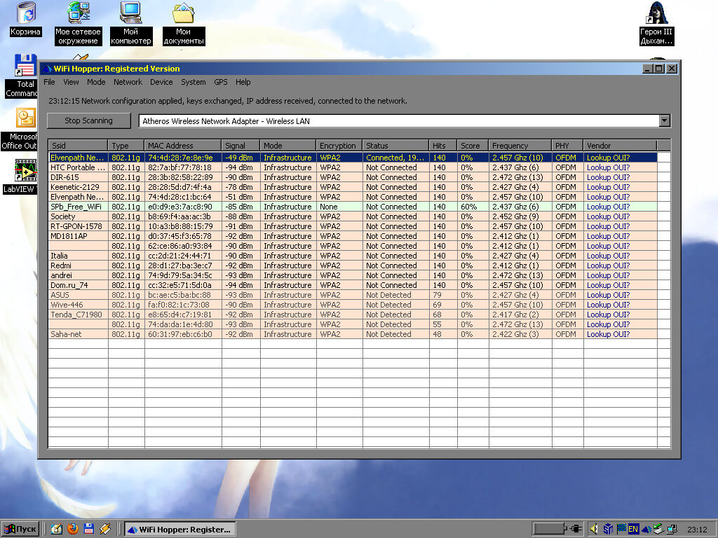 Непросто оказалось подключиться к современной точке доступа — Windows 2000 не поддерживает WPA и WPA2, в целом, поддержка Wi-Fi была в зачаточном состоянии. Спасла программа Wi-Fi Hopper, которая умеет перехватывать управление адаптером и своими силами обеспечивает поддержку шифрования.