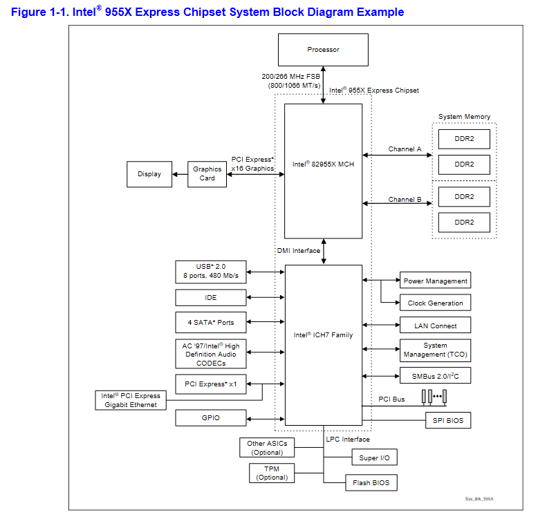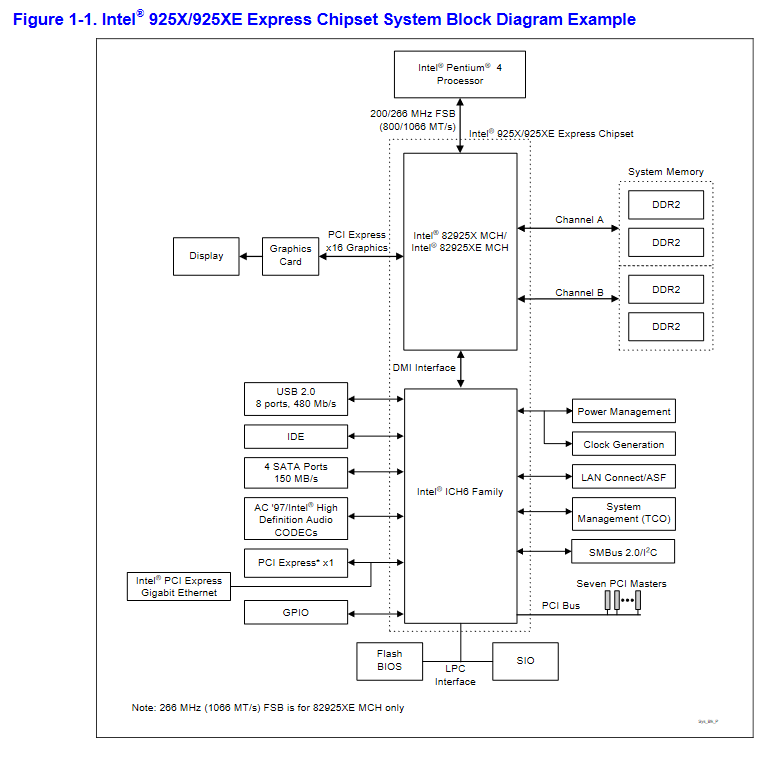 Модифицированная PCI-E x4 под названием DMI использовалась и для связи северного и южного мостов (простите, хабов!). Северный мост обеспечивал 16 линий PCI-E для видеокарты, ещё 4 линии предоставлял южный мост.