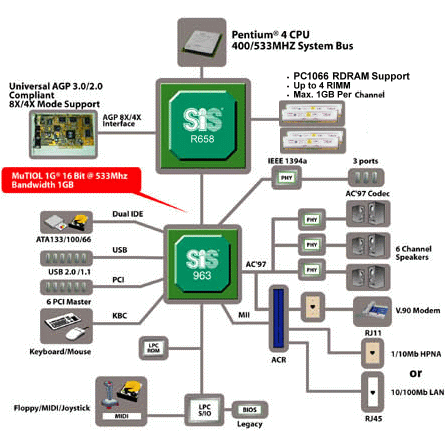 Вечный аутсайдер SiS наслаждался успехом — именно его чипсеты устанавливались в большинство «настольных» ноутбуков и недорогих компьютеров. Денег прибавилось, прибавилось и амбиций — SiS замахнулась на лавры «Самого Продвинутого Чипсета Для Энтузиастов» — да, именно так, с большой буквы. В конце 2002 года, когда Intel уже выпустила свой E7205 (чипсет с поддержкой двухканальной DDR266), пропускная способность которой идеально соответствовала потребностям процессора, в преддверии анонса процессоров с 800 МГц шиной, компания выпускает SiS R658 — чипсет с поддержкой двухканальной RDRAM PC4200/4800…