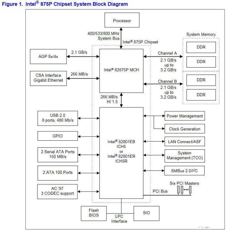 Для интеграции гигабитных сетевых контроллеров была предусмотрена выделенная шина CSA — Communication Streaming Architecture, иначе узким местом становилась уже PCI, пропускную способность которой пришлось бы делить на всех. Интересно, что более скоростные версии шины на десктопах так и не прижились, хотя классической 33 МГц 32-битной версии было недостаточно.