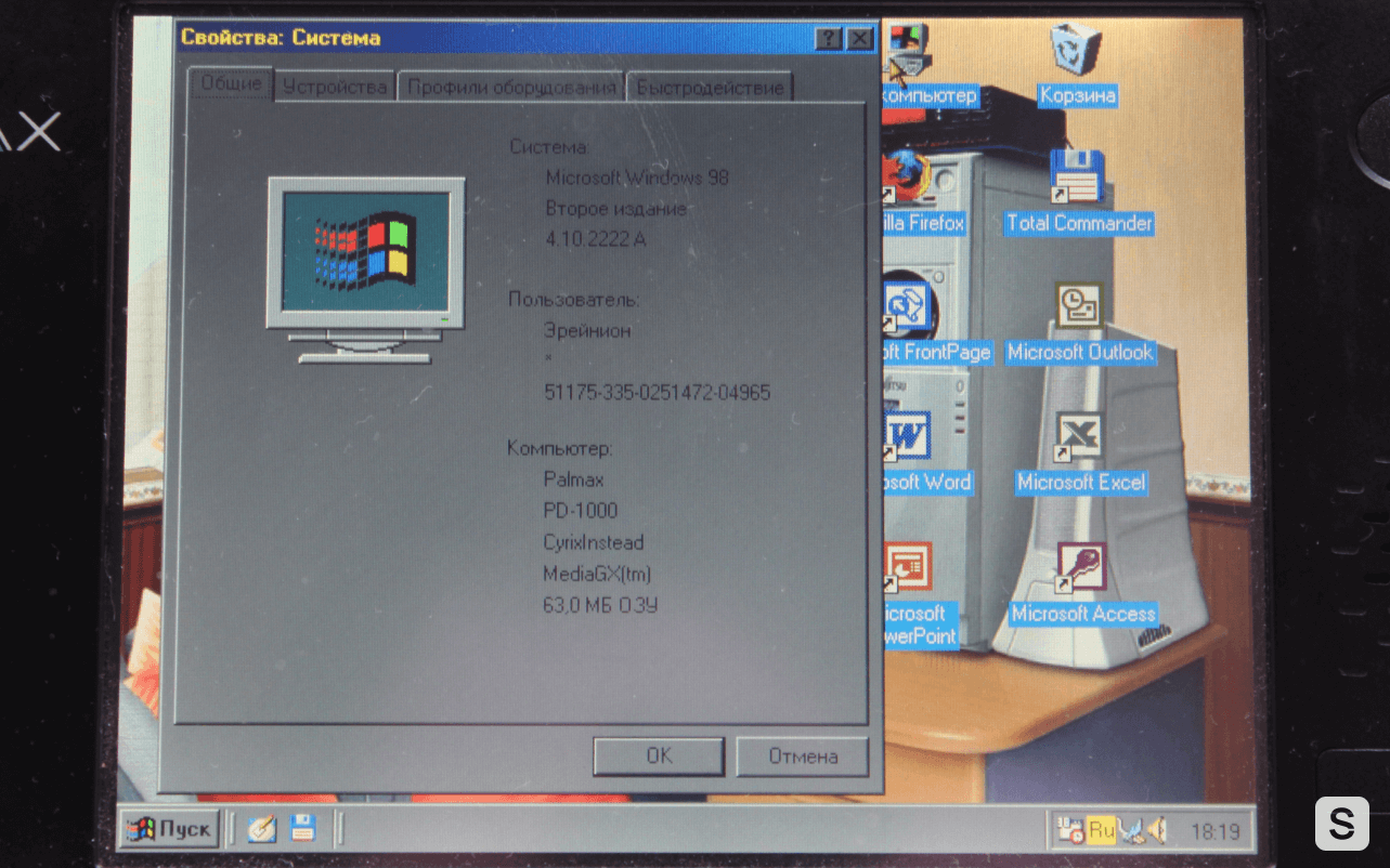 Система работает под управлением Windows 98 Second Edition и это объективно самая подходящая для него операционная система. С более тяжелыми Windows NT/2000 MediaGXm справляется уже с трудом, а основанная на DOS “девяносто восьмая” работает шустро и позволяет использовать все необходимые приложения.