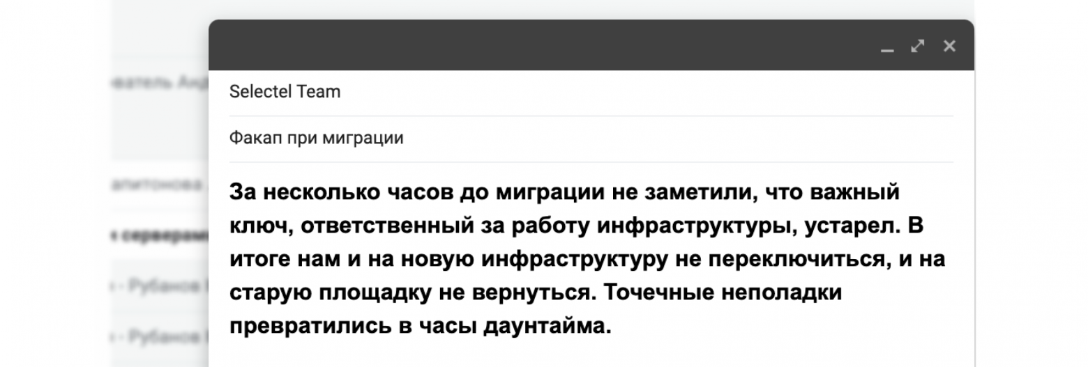 Недавно мы провели митап, посвященный миграции инфраструктуры. Участники поделились опытом переезда и прислали анонимные факапы к нам на почту. Я решил разобрать самые частые, ведь лучше учиться на чужих ошибках, чем на своих.