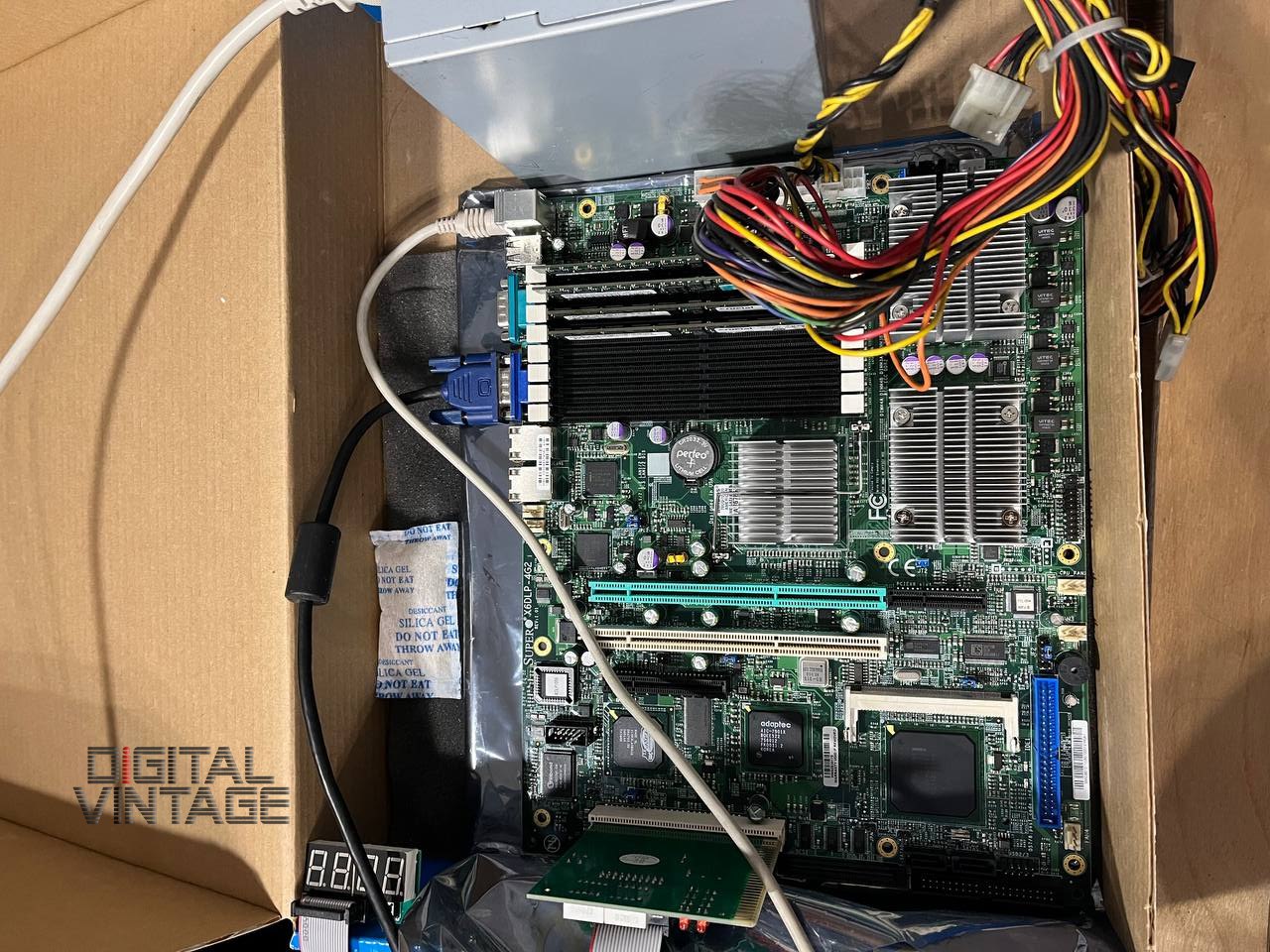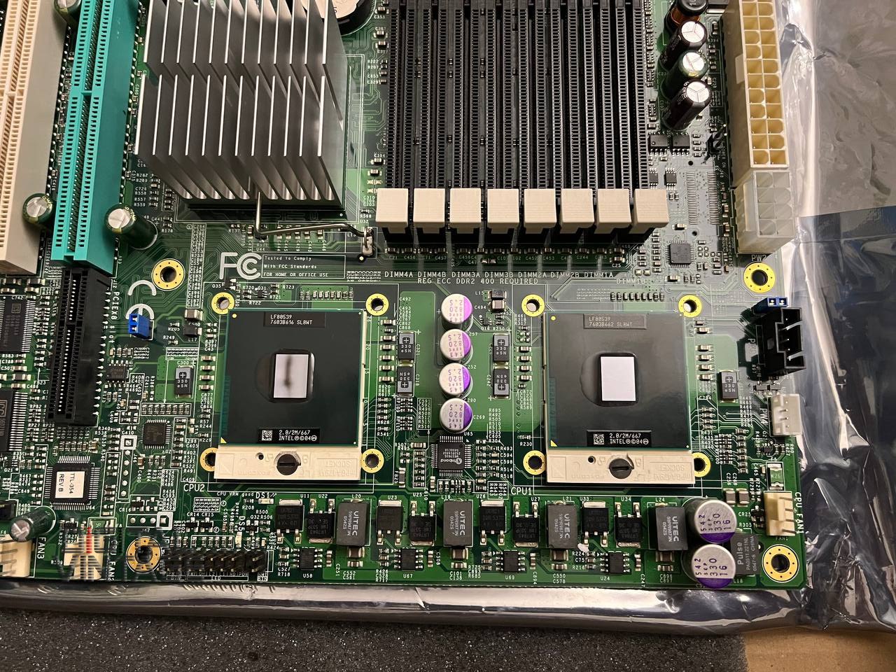 А вот причем! В конце 2005 года, на фоне ожидаемого выхода первых двухядерных процессоров для ноутов начали появляться слухи некоем чипсете Intel 955XM с поддержкой будущих мобильных (!) Xeon, которые разрабатываются под кодовым именем Sossaman. Чуда (вероятно, к счастью) не случилось и двухпроцессорные ноуты на мобильных "камнях" так и остались несбыточной мечтой гиков. А вот процессоры Sossaman все же были представлены, но предназначались для рынка промышленных компьютеров. Именно такая система перед нами - новая (!) двухпроцессорная плата на серверном чипсете Intel E7520, два Xeon LV 2.0 GHz (по сути аналог Core Duo T2500) и 6 гигов оперативки (можно поставить до 16)! Живое, прикольное, шевелится! Будем делать новую сборку)