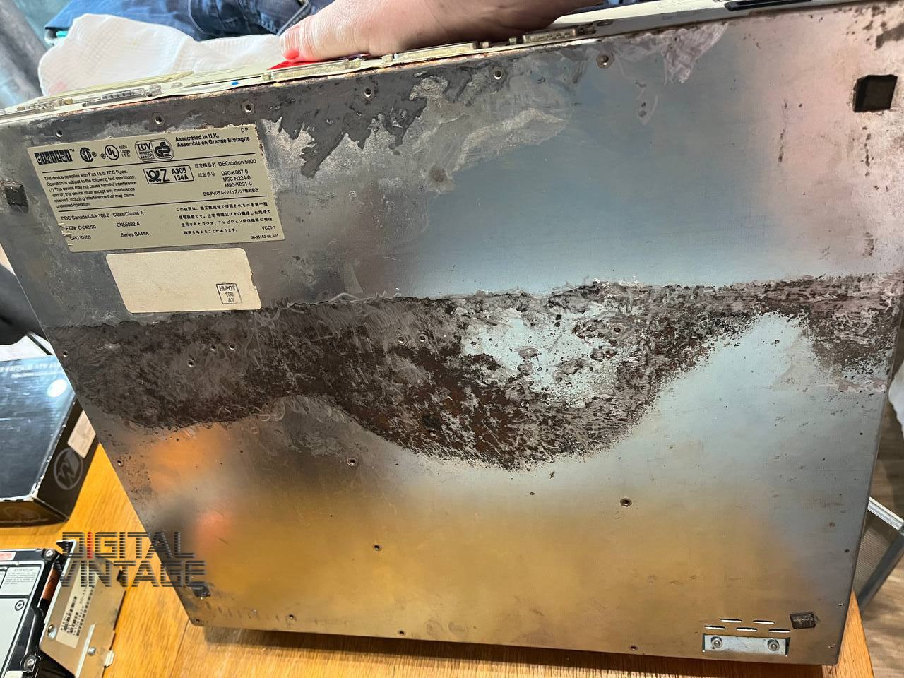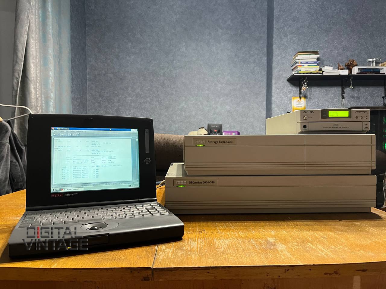 Пока нет родного монитора и клавомышки, машина используется с терминалом, в роли которого выступает DEC'овский же ноутбук 1994 года. Еще одним аксессуаром стал двухскоростной CD-ROM AIWA - ОС не сохранилась и с него она будет установлена. Машина хранилась в гараже и, естественно, требовала небольших реставрационных работ. С очисткой от ржавчины и чисткой мне здорово помог сын Александр, грандиозный респект ему за это! Мне оставалось только почистить все разъемы на плате (без этого машина стартовала нестабильно) и заменить тухлый даллас протезом. Следующий этап - установка операционки и поиск кабеля для подключения монитора и клавомышки - родная ОС Ultrix имеет графическую оболочку и работать через терминал не так уж интересно.