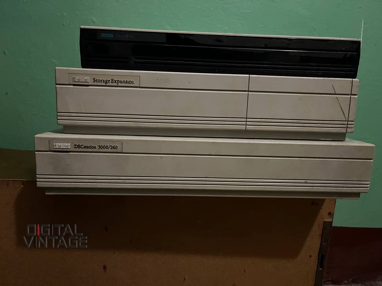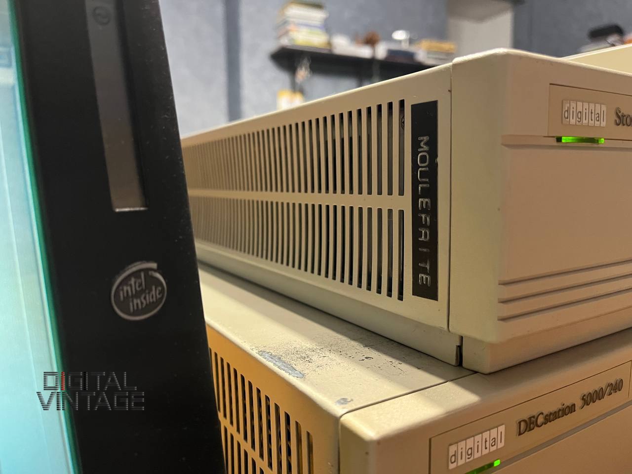 Итак, перед вам рабочая станция DECstation 5000/240, официально (см. фото!) проапгрейженная до модели 260, в комплекте с родной дисковой полкой Storage Expansion. Дата производства - 7 мая 1992 года, апгрейд - 1993 год. Машина принадлежала одному из предствательств самой Digital! Внутри живет процессор MIPS R4000 (был такой период у DEC!) с частотой 60 МГц, при этом часть вычислительных блоков работает на 120 МГц. Памяти - 160 Мбайт, 64 было установлено на заводе и 96 при замене процессора. На борту есть сетевой контроллер Ethernet. Для расширения используется шина TurboChannel. Установлена видеокарта - базовый 2D ускоритель Smart Framebuffer, поддерживающий разрешение 1280х1024 при 256 цветах. Среди опций были True Color карты и 3D ускорители. А вот диск живет отдельно - в базовом варианте станция рассчитана на сетевую загрузку.