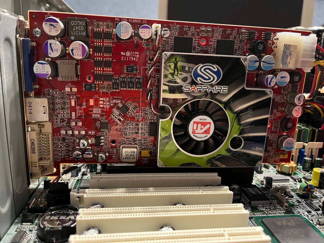 Закрыл очередной гештальт! Наконец-то, у меня появилась живая видеокарта одной из моих любимых серий - ATI R3x0, точнее Radeon 9800 PRO 128 MB с GPU R360. Из-за горячего нрава и совершенно не соответствующего ему охлаждения, их дожило до нашего времени совсем мало. Этот экземпляр производства Sapphire оснащен чуть более продвинутым, чем обычно кулером, но все равно с неба звезд не хватает. Сильно нагружать его не буду, поставлю в сборку на паре Xeon 3.06 с платой Asus PC-DL - ее я достаю погонять нечасто, шумновата получилась.