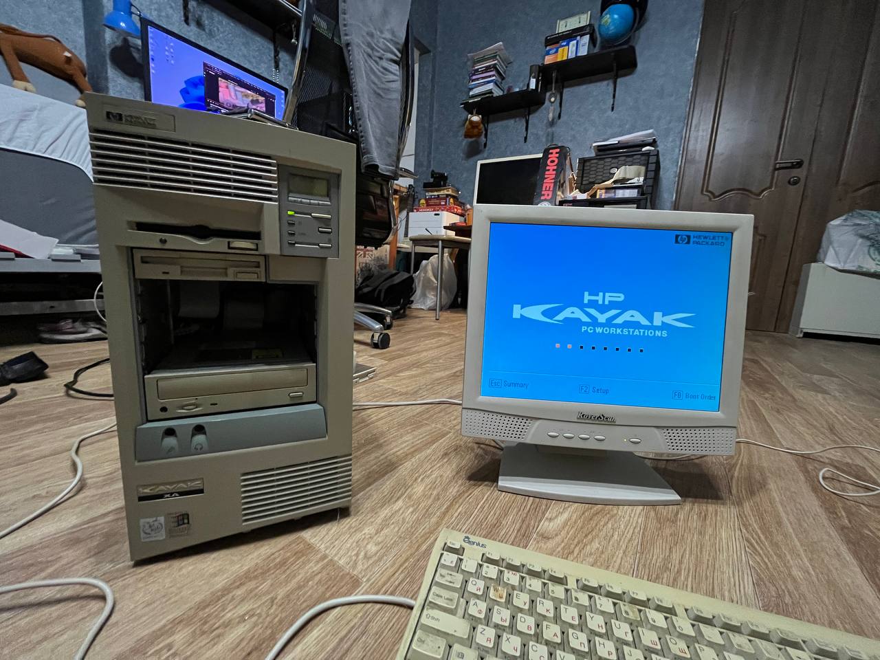 А вот еще один долгострой! Красивый, редкий, желанный - и от того не менее "дырявый". HP Kayak XA - младшая модель в линейке х86 рабочих станций HP. Всего один процессор - слотовый Pentium III, пока еще проприетарная материнская плата с собственным БП (в следующих моделях будет обычный АТХ от Asus...). Фирменная фишка - информационный экранчик, пока еще без подсветки (что интересно, на горизонтальных версиях его не вовсе было).