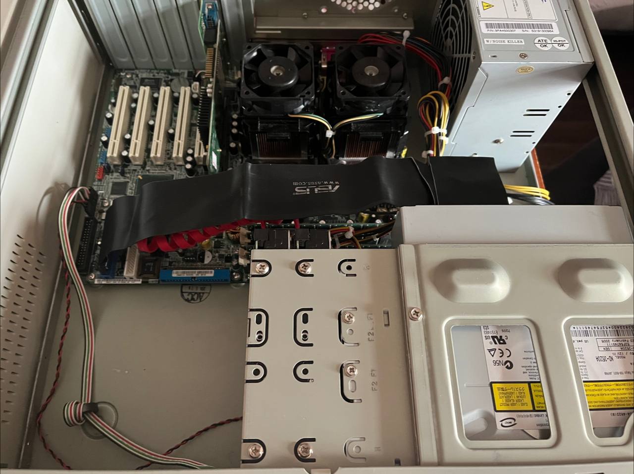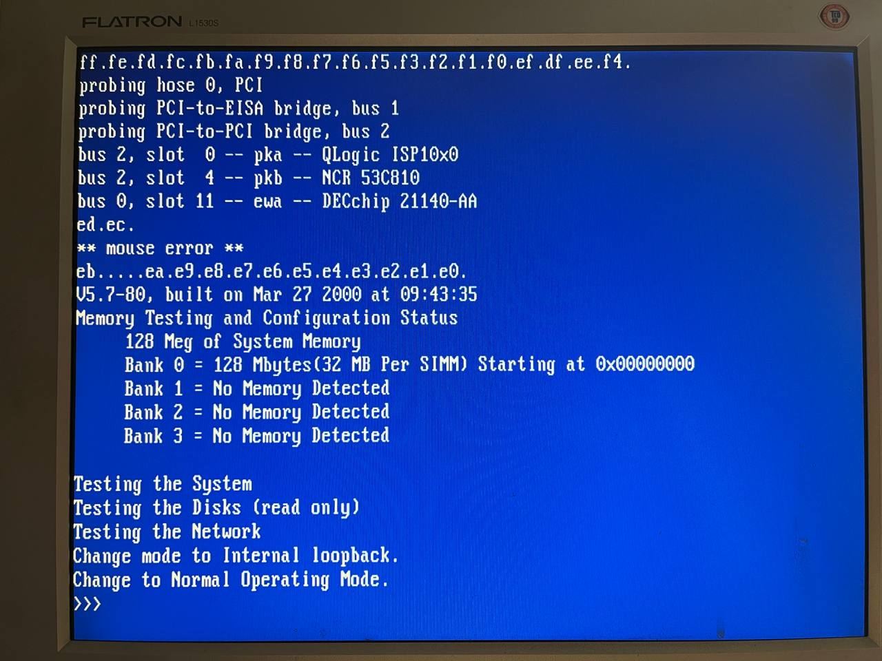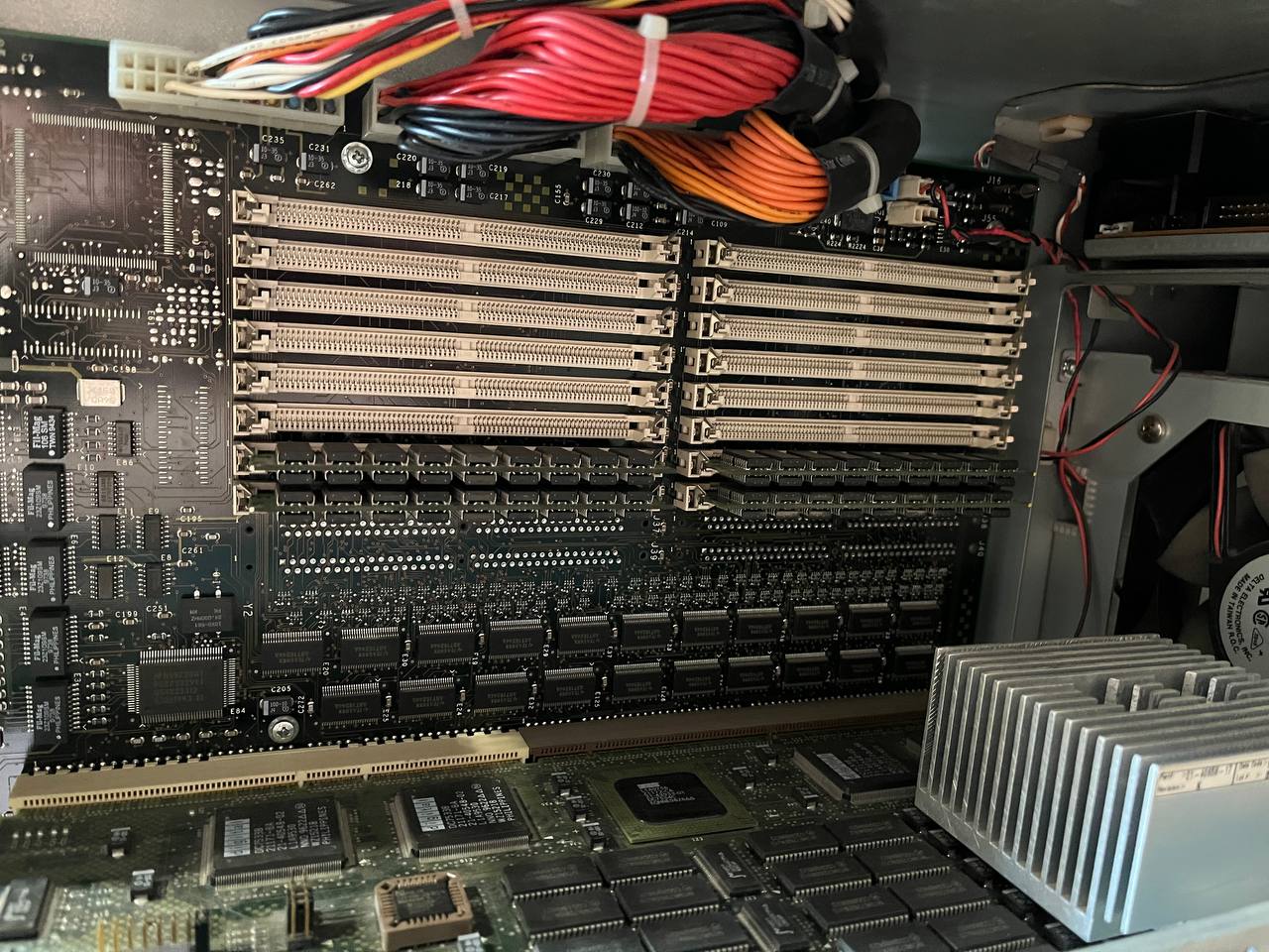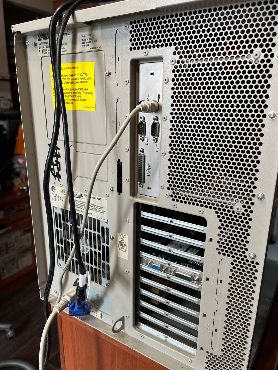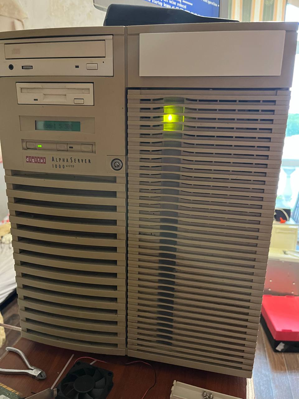 Представленный экземпляр - тот еще франкенштейн: табличка на корпусе гласит "AlphaServer 1000 4/200", на носу - уже "4/233", фактически же - это уже "5/300". Приехал он несколько дней назад из Воронежа. Продавался "в неизвестном состоянии, включить не сумели". Оказалось - вполне себе живой, просто из БП изъяли вентилятор. Вот он и выключался через 10 секунд - во избежание.