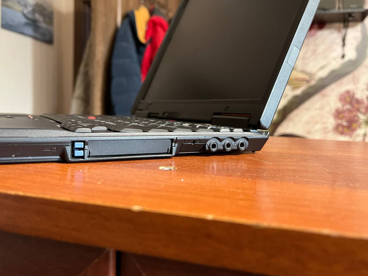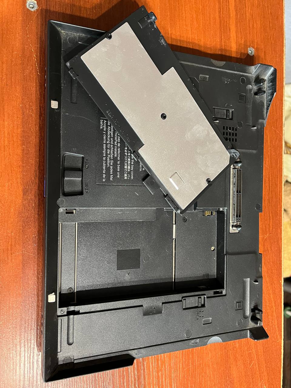 Вот и близкий по духу к предыдущему герою аппарат - IBM ThinkPad 570E. Одношпиндельник с продвинутым доком. В доке так же флоппик, двд 📀 читалка, колонки и немного портов. При этом нету сетевой карты - ни в ноуте, ни в доке. Зато док выглядит монолитнее, когда прикреплён к ноуту, а ещё в него можно поставить батарейку. Вместо флоппи, но не в его отсек - хитрость видно на фото.
