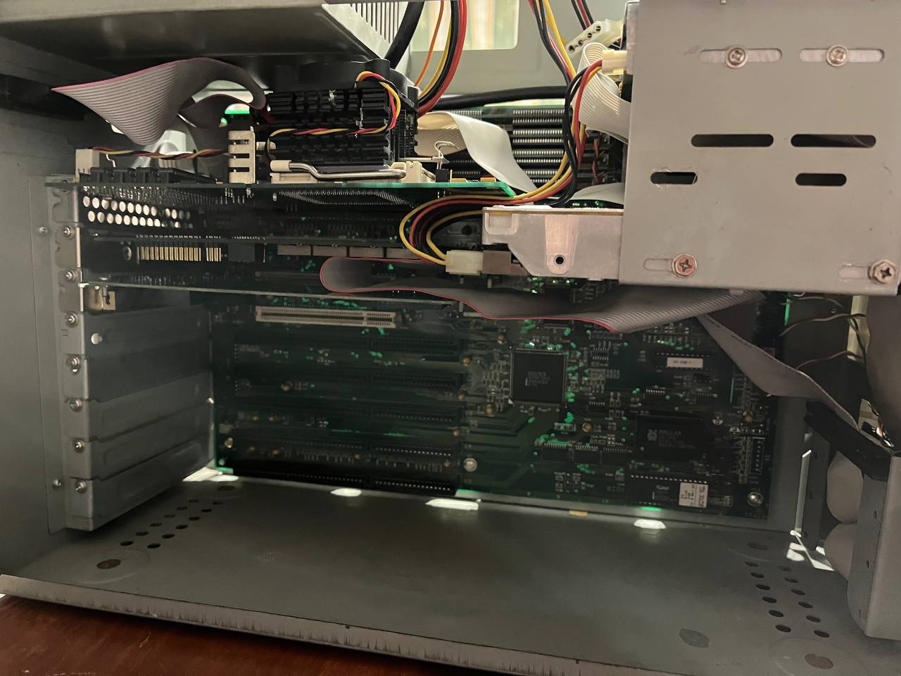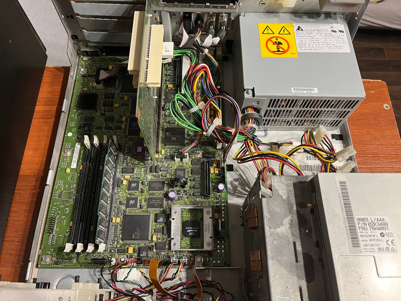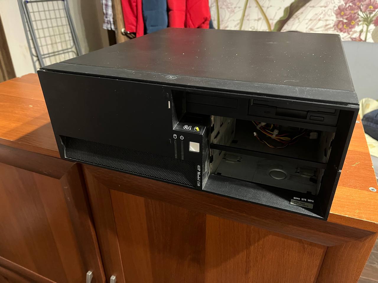 Чего не хватает: - процессорного кулера (сам процессор тут удивительно компактный - квадрат со стороной в 1 дюйм!) - видеокарты - шлейфа накопителей (а тут еще и хитрый разъем на материнке) - оптического привода (здесь черный и сказевый) - нижней заглушки (или стримера) - усиливающей перекладины корпуса совместно с держателем жестких дисков Так что - открываю поиски) Что-то полагаю подойдет от IBM PC365 и родственных моделей (корпуса одинаковые, отличаются в основном передней панелью). Из приятного - машина запускается и начинает считать POST-коды. Уже хорошо)