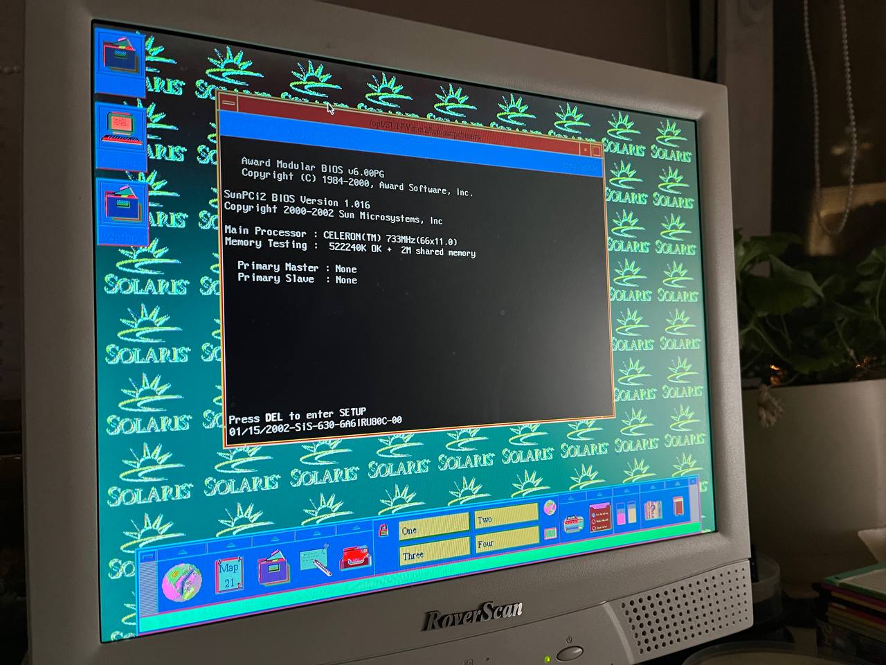 143 МГц 256 МБайт памяти (поддерживается до 1 Гбайт) 2 Гбайт SCSI диск (SCA разъем, 7200 об/мин) На борту сеть и звук. Видео обычное, не 3D - это была прерогатива версии 3D Creator. Операционка - Solaris 2.5 и его родная оболочка OpenWindows 3.5. Что забавно - логин все еще текстовый, графический появляется только в с установкой опциональной CDE.