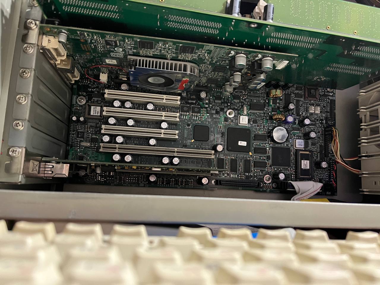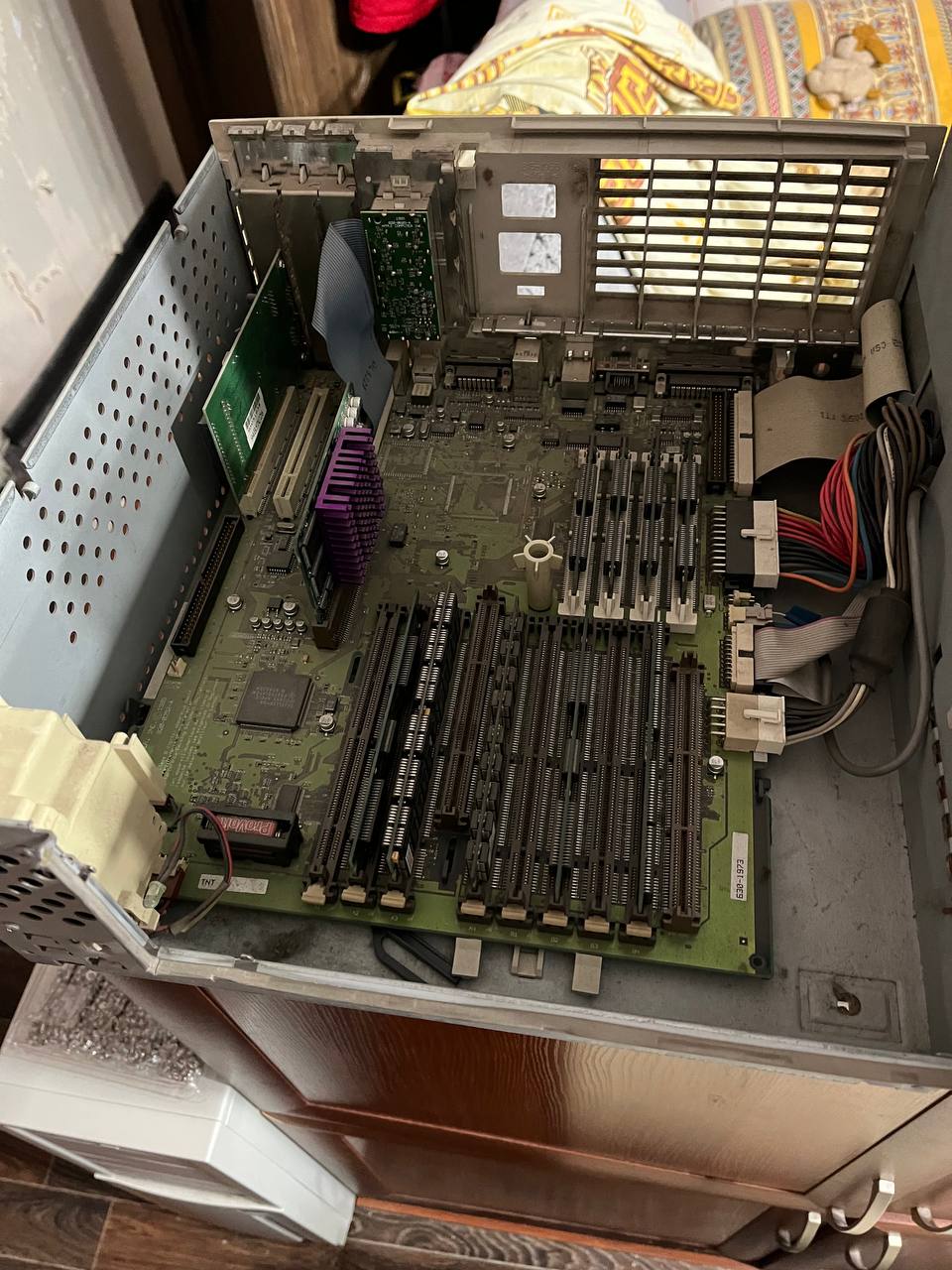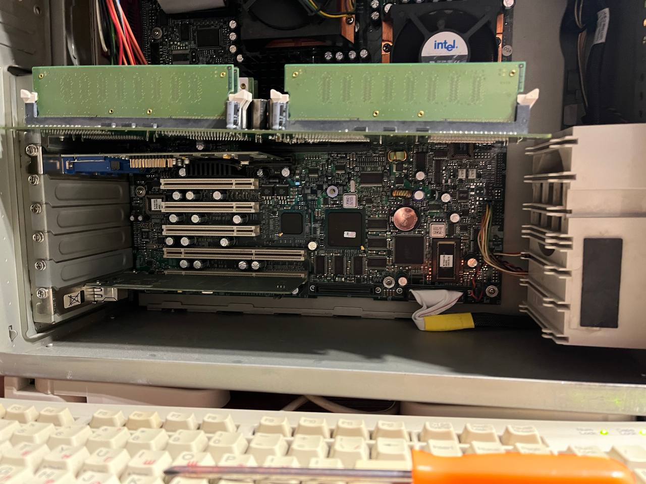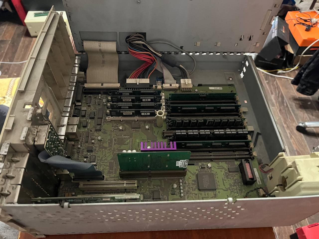 Одна из весьма примечательных машин в коллекции. Рабочая станция на двух Xeon Prestonia, в основе плата с чипсетом Intel 860, работающим с памятью Rambus. Чтобы установить более 4 модулей требовались дополнительные контроллеры - поэтому память вынесена на отдельную плату: на одну доску все просто не поместилось.