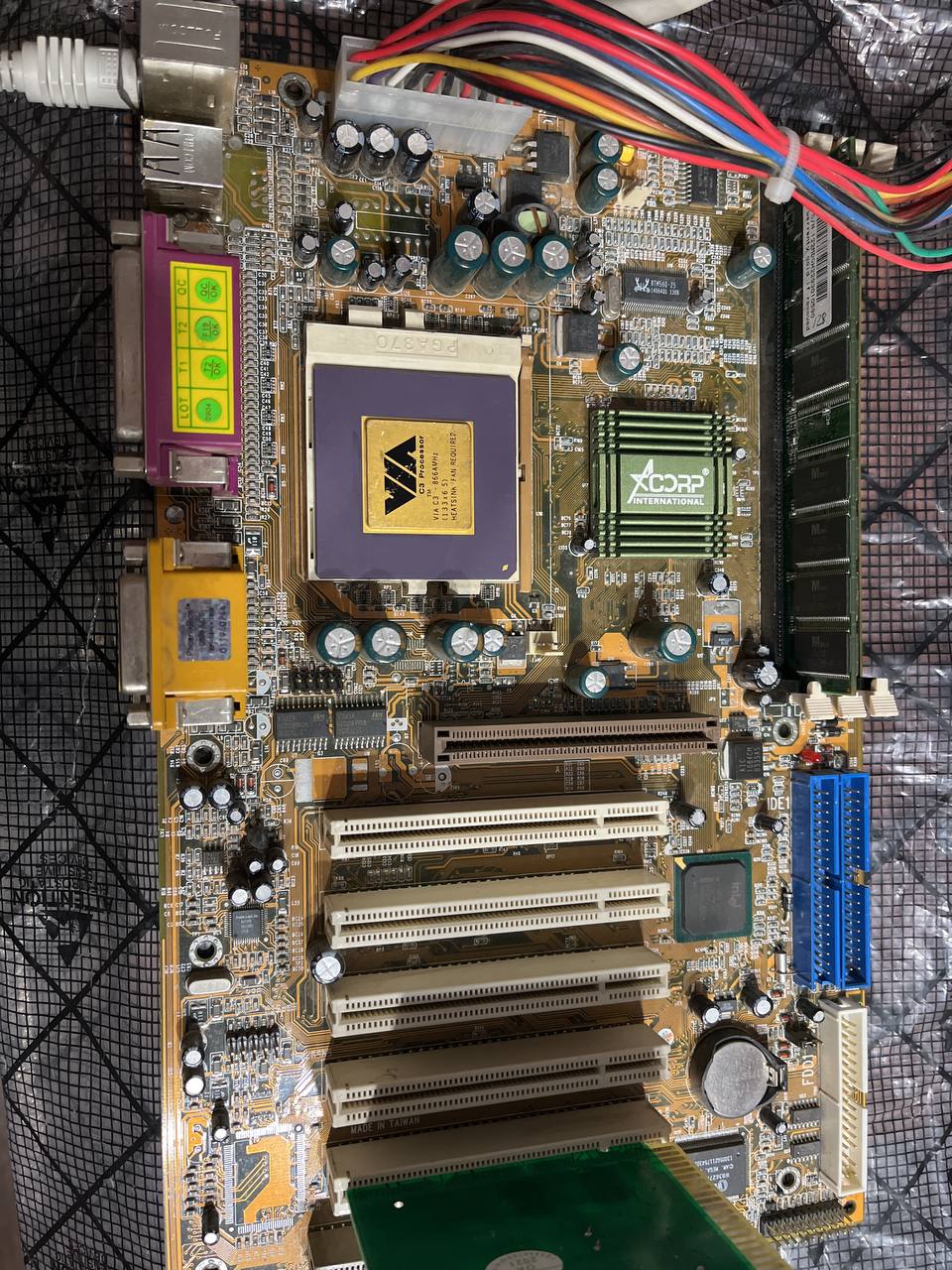 Забавная дичь. Красивый, но бесполезный процессор от VIA во вполне адекватной по тем временам матери на i815. Ессно, только для тестов - ждём созвучную ему материнку на тормозном PLE133!