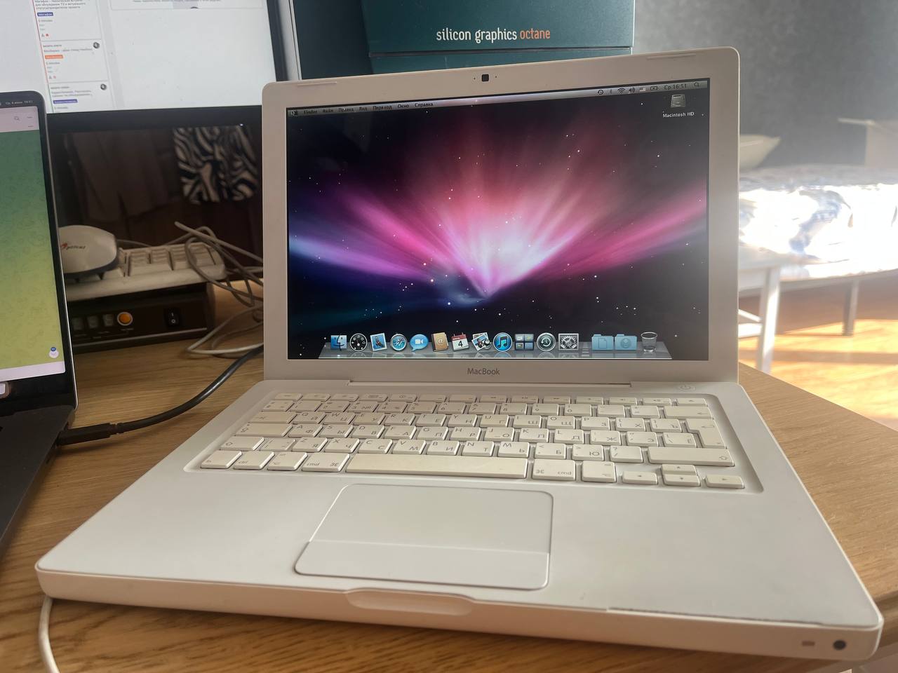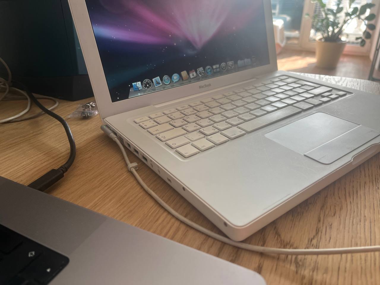 Пойдем дальше по фруктовой роще. Эта машина выпущена полтора года спустя, но по всем характеристикам она уступает девайсу из предыдущего поста (разве что памяти тут можно поставить до 4 ГБайт благодаря чипсету i965). Да и выглядит ноут заметно скромнее - корпус из пластика, меньше разъемов для подключения внешних устройств, заметно ниже разрешение экрана (1280х800) - все в нем выдает бюджетную модель. Собственно, так оно и есть - просто MacBook, так же известный как "белый Макбук" - самая младшая модель, входной билет в мир Apple в 2006-2010 годах. Минимальная конфигурация стоила тогда 999 убитых енотов - сейчас эту позицию занимает куда более интересно сделанный MacBook Air, тогда же пластиковый корпус не был чем-то ущербным - напротив MacBook Pro казались сверхпремиальными с их полностью металлическими корпусами.