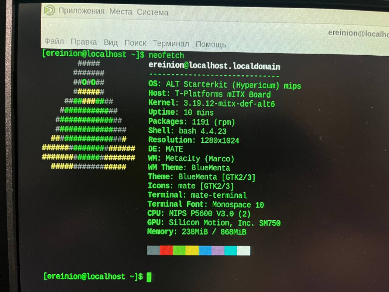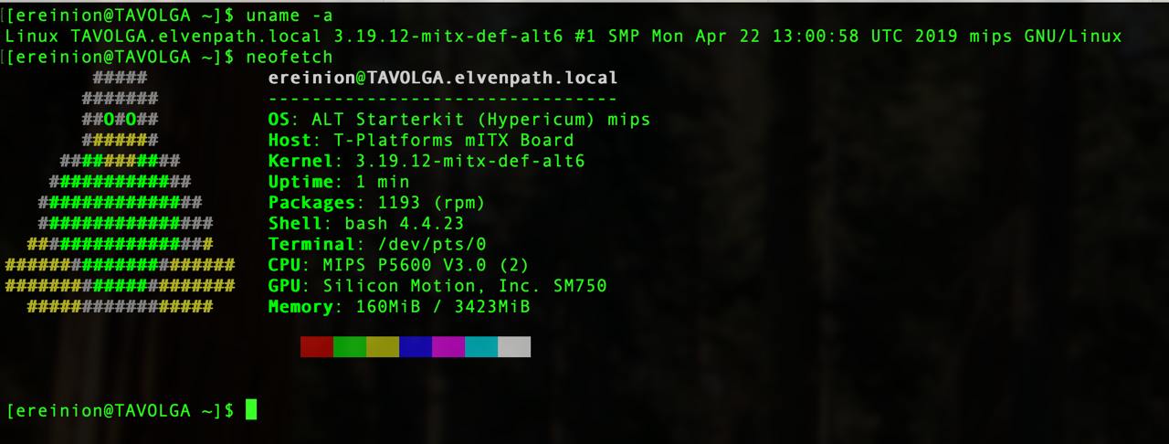 Вот такая забавная зверушка. Два 32-битных ядра MIPS, 8 Гбайт памяти (на самом деле 3.4 - видит всегда почему-то чуть меньше половины, сколько ни поставь), набортный SSD на 16 Гбайт и двухмерное видео Silicon Motion. У меня работает под Альт Линукс.