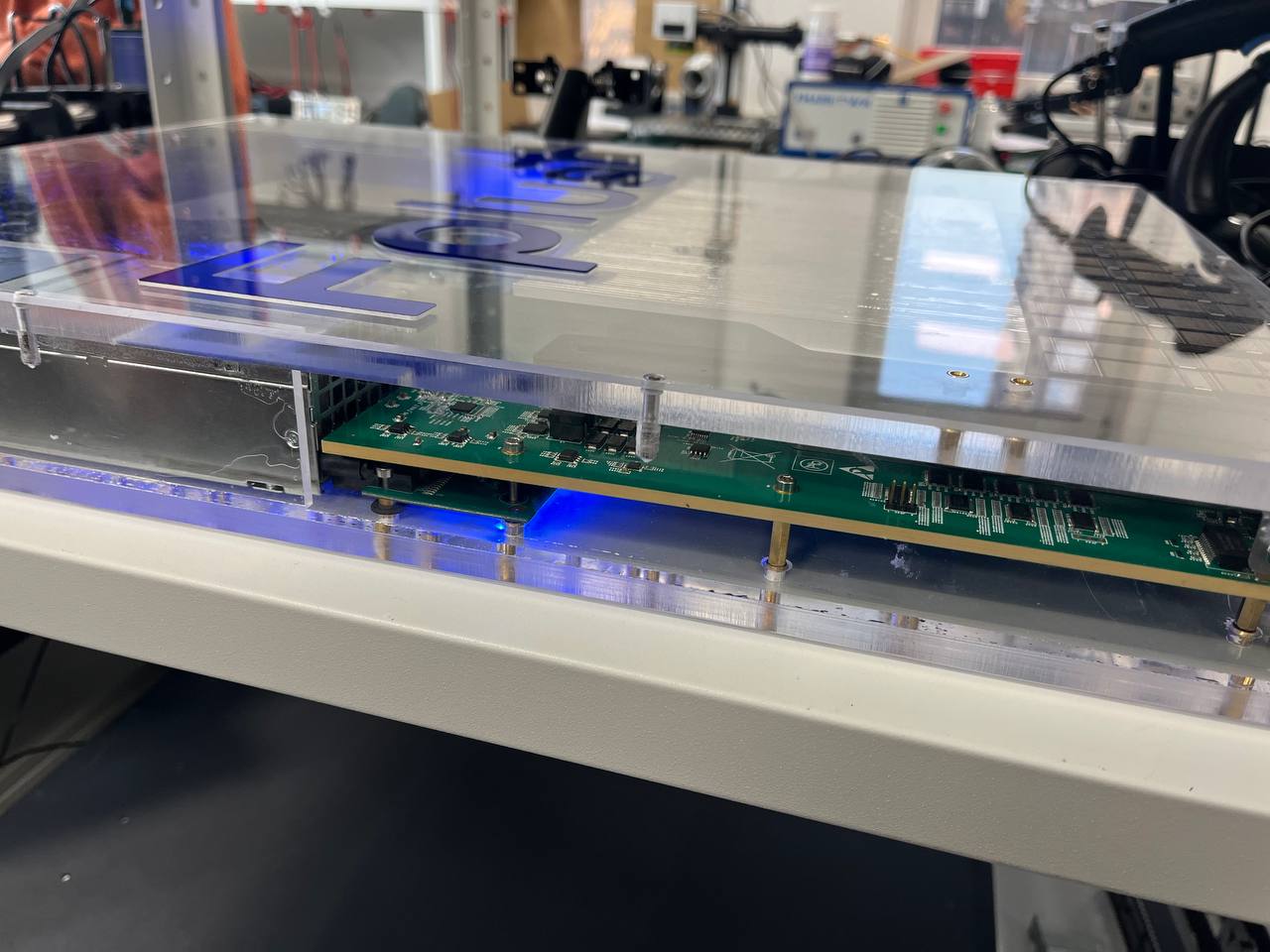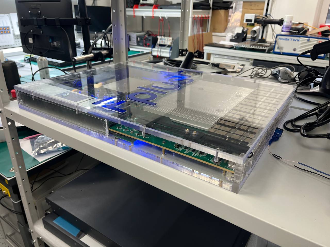 Был сегодня в лаборатории у одного из производителей сетевого оборудования. Действительно сами разрабатывают интересные вещи. На фото - демо-образец 400 Гбит коммутатора. Обратите внимание на толщину платы!