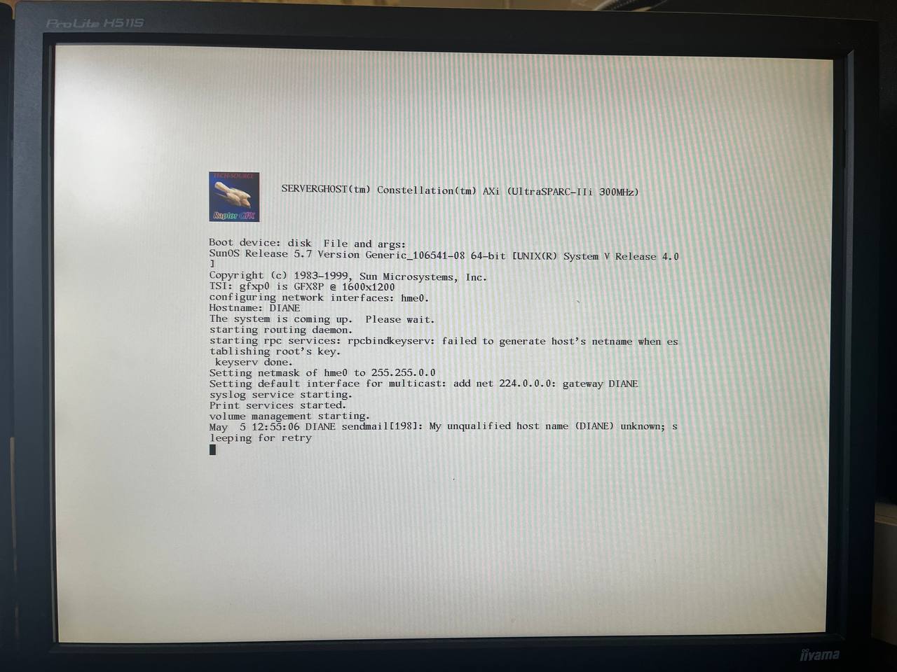 А вот чудо-агрегат и готов! UltraSPARC IIi на 300 МГЦ и 256 Мбайт EDO памяти довольно шутро тащат на себе седьмой Solaris, видеокарта TechSource Raptor GFX (это ее логотип система выводит при включении) на базе чипа 3DLabs Permedia 2 отлично работает в разрешении 1600х1200, а быстрый SCSI-диск на 10000 оборотов отлично встроился в эту команду. Ну и, как всегда, необычная машинка под собственным брендом собрана в моем любимом ящике InWin H500)))
