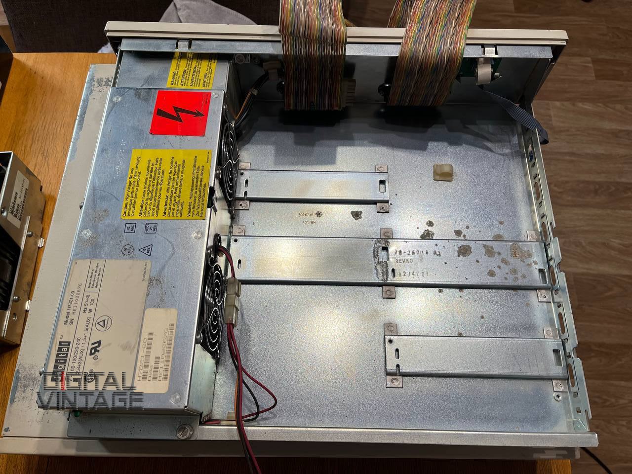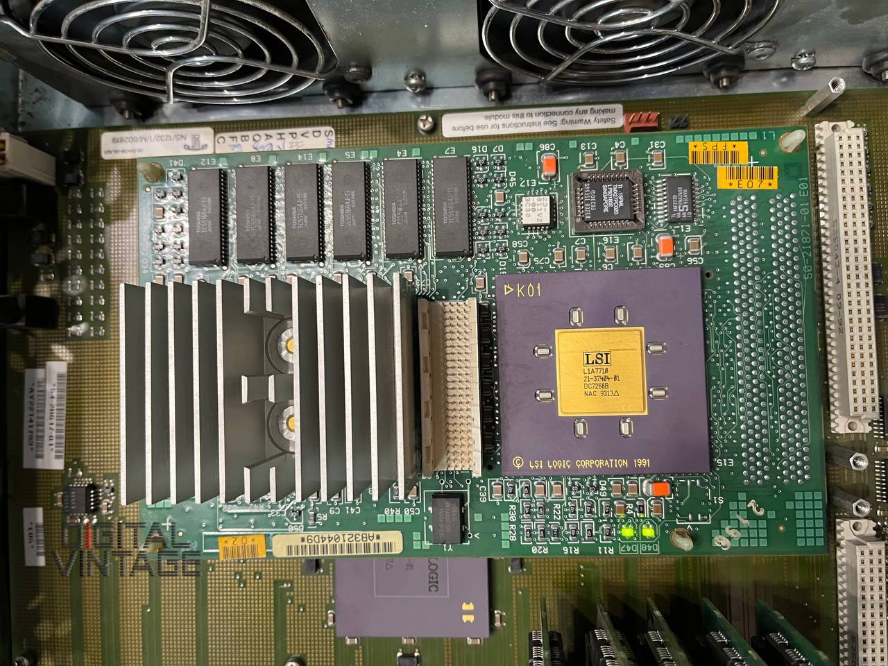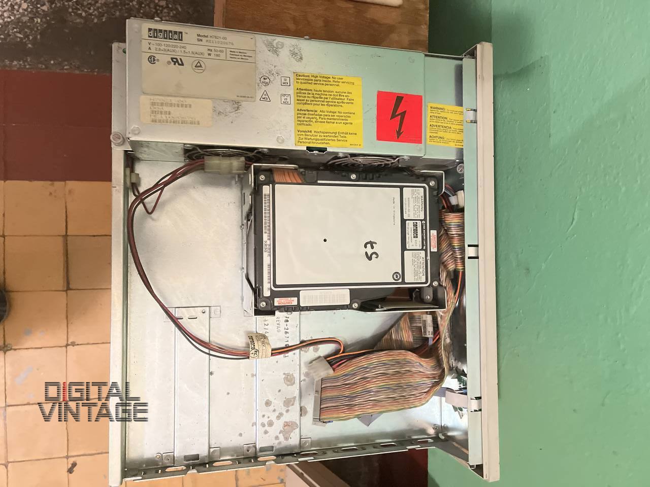 Итак, перед вам рабочая станция DECstation 5000/240, официально (см. фото!) проапгрейженная до модели 260, в комплекте с родной дисковой полкой Storage Expansion. Дата производства - 7 мая 1992 года, апгрейд - 1993 год. Машина принадлежала одному из предствательств самой Digital! Внутри живет процессор MIPS R4000 (был такой период у DEC!) с частотой 60 МГц, при этом часть вычислительных блоков работает на 120 МГц. Памяти - 160 Мбайт, 64 было установлено на заводе и 96 при замене процессора. На борту есть сетевой контроллер Ethernet. Для расширения используется шина TurboChannel. Установлена видеокарта - базовый 2D ускоритель Smart Framebuffer, поддерживающий разрешение 1280х1024 при 256 цветах. Среди опций были True Color карты и 3D ускорители. А вот диск живет отдельно - в базовом варианте станция рассчитана на сетевую загрузку.