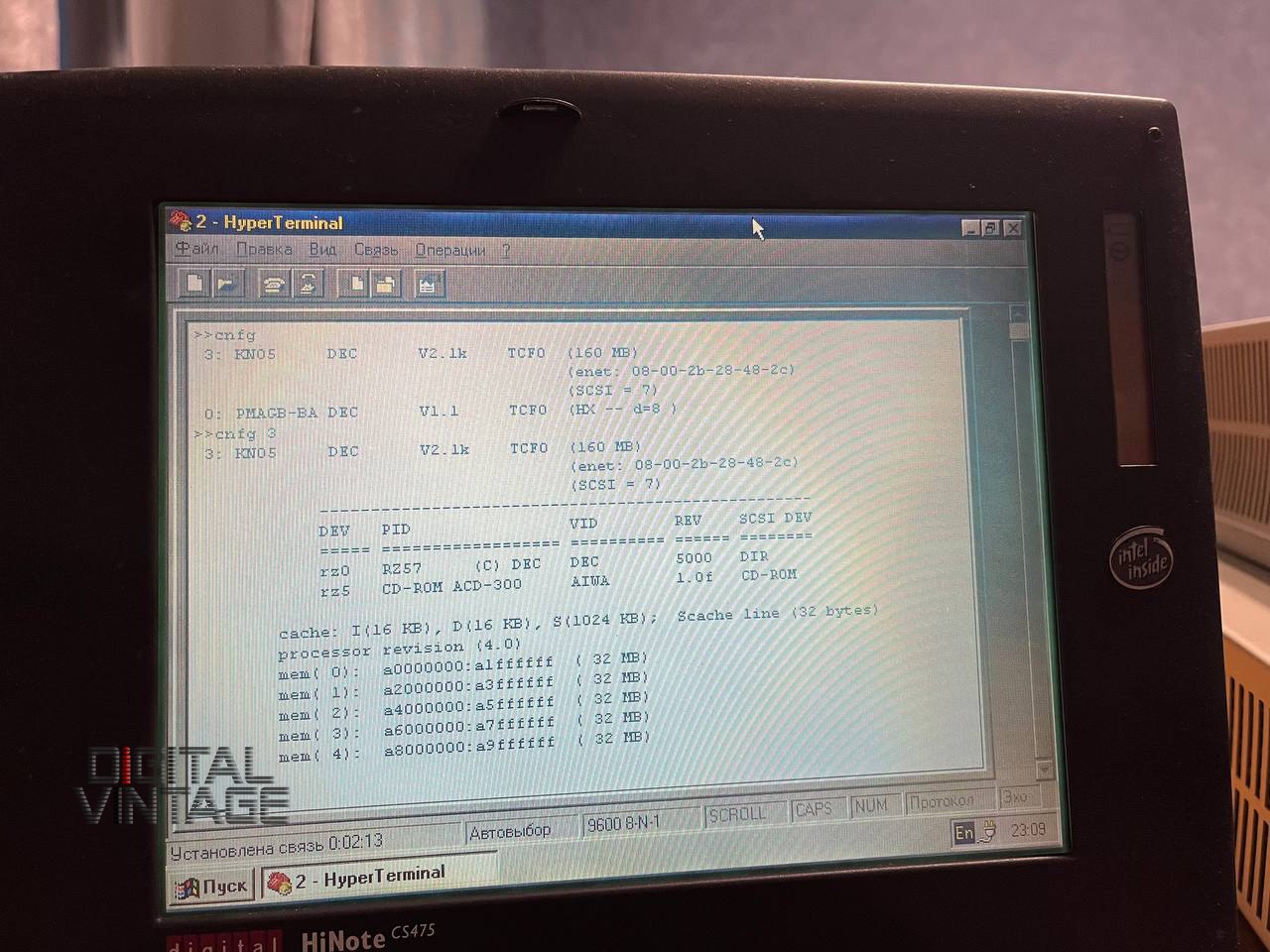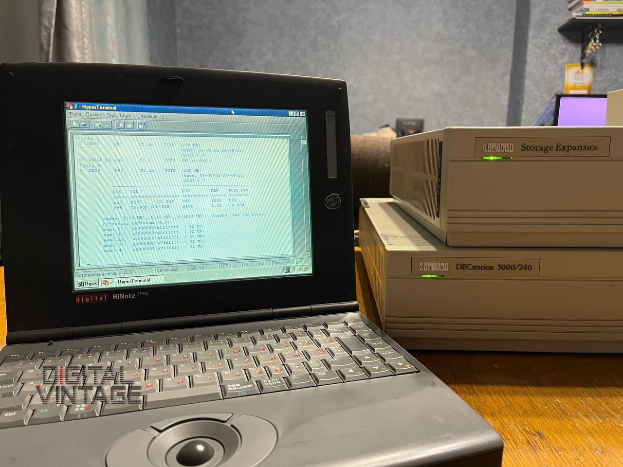 Пока нет родного монитора и клавомышки, машина используется с терминалом, в роли которого выступает DEC'овский же ноутбук 1994 года. Еще одним аксессуаром стал двухскоростной CD-ROM AIWA - ОС не сохранилась и с него она будет установлена. Машина хранилась в гараже и, естественно, требовала небольших реставрационных работ. С очисткой от ржавчины и чисткой мне здорово помог сын Александр, грандиозный респект ему за это! Мне оставалось только почистить все разъемы на плате (без этого машина стартовала нестабильно) и заменить тухлый даллас протезом. Следующий этап - установка операционки и поиск кабеля для подключения монитора и клавомышки - родная ОС Ultrix имеет графическую оболочку и работать через терминал не так уж интересно.