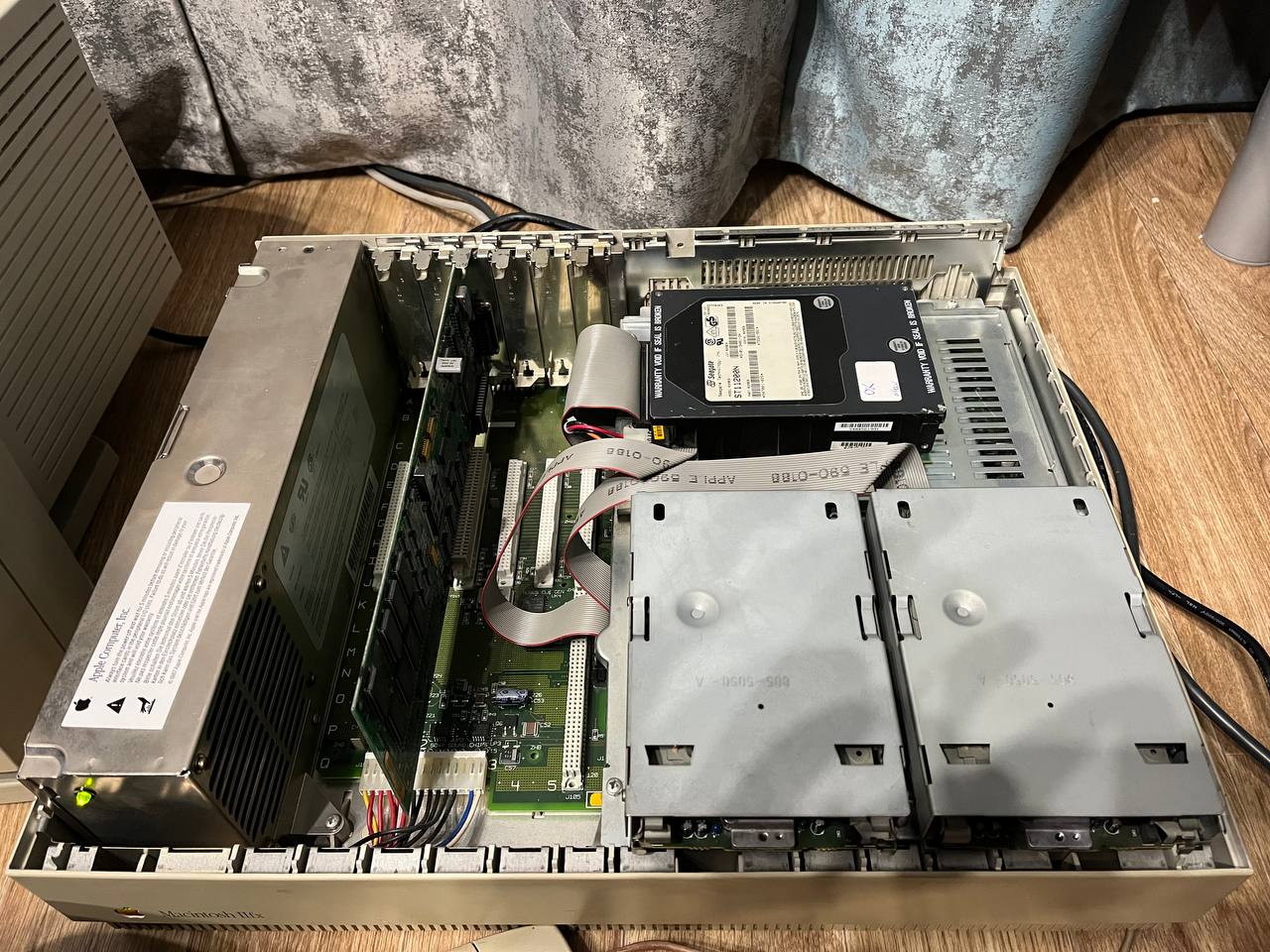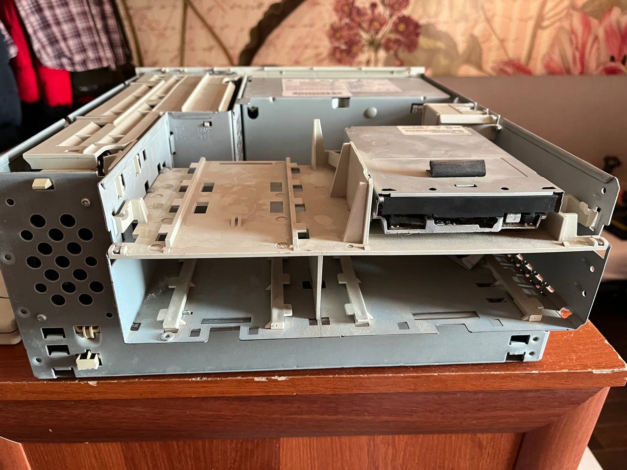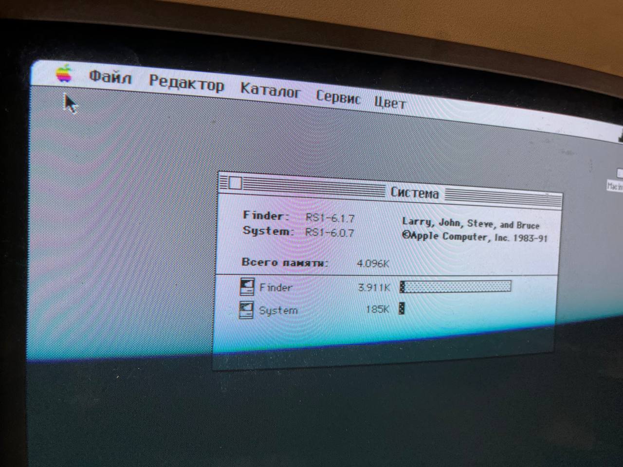 Конфиг: PowerPC 750 (G3) 233 МГц 512 Кбайт кэша (1/2 частоты ядра) 128 Мбайт ОЗУ (было 32) 2 Гбайт IDE HDD 2 Мбайт ATi Rage вместо видео (можно добавить видеопамяти до 6 Мбайт) На борту сеть, скази и звук. CD-ROM не доложили) Стоит Mac OS 9.2, с завода должна была быть 8.0, будем ставить 8.6.