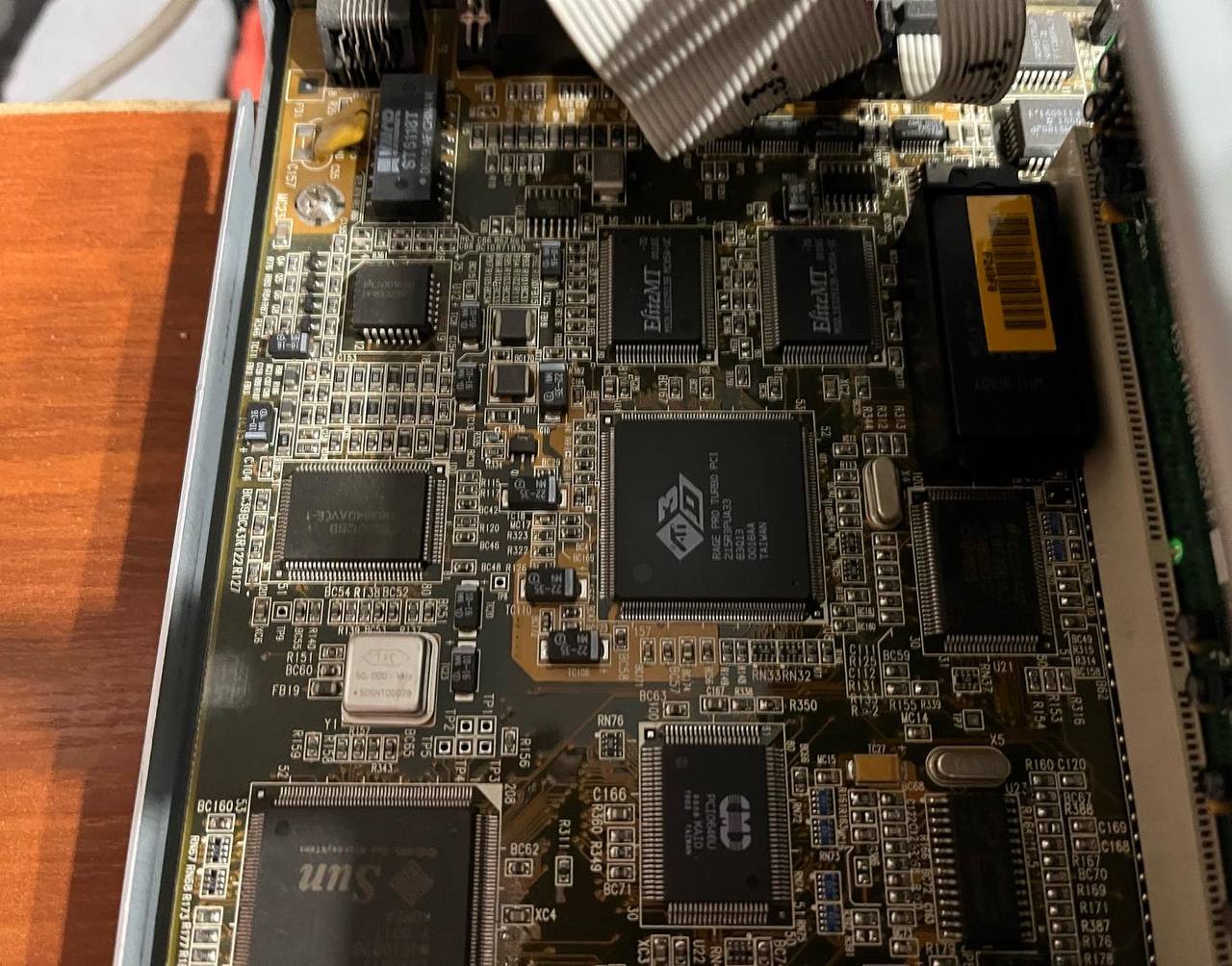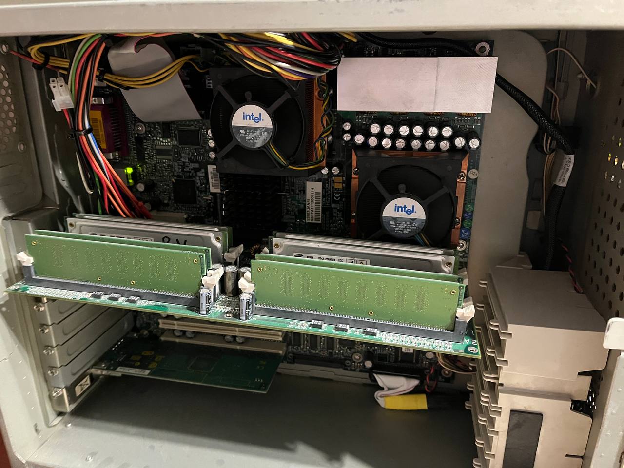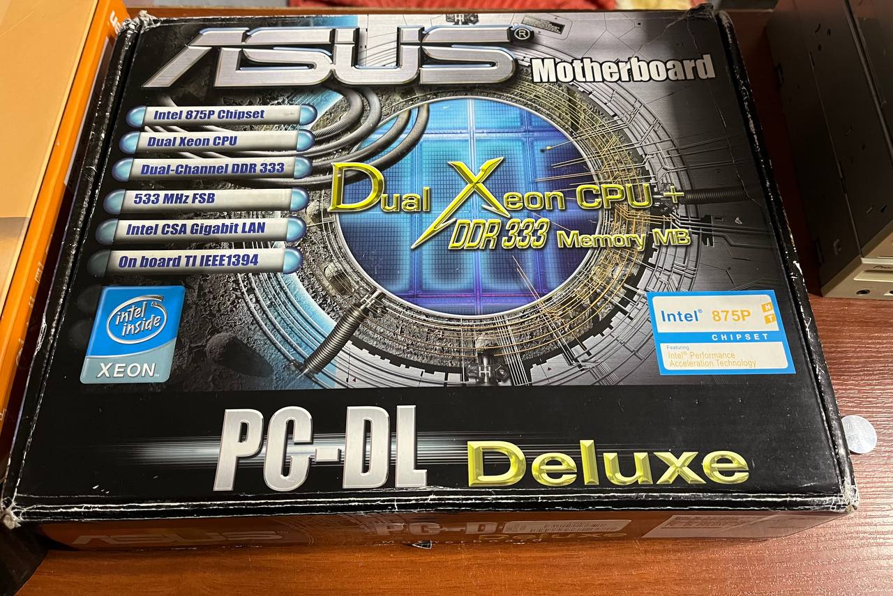 Одна из весьма примечательных машин в коллекции. Рабочая станция на двух Xeon Prestonia, в основе плата с чипсетом Intel 860, работающим с памятью Rambus. Чтобы установить более 4 модулей требовались дополнительные контроллеры - поэтому память вынесена на отдельную плату: на одну доску все просто не поместилось.