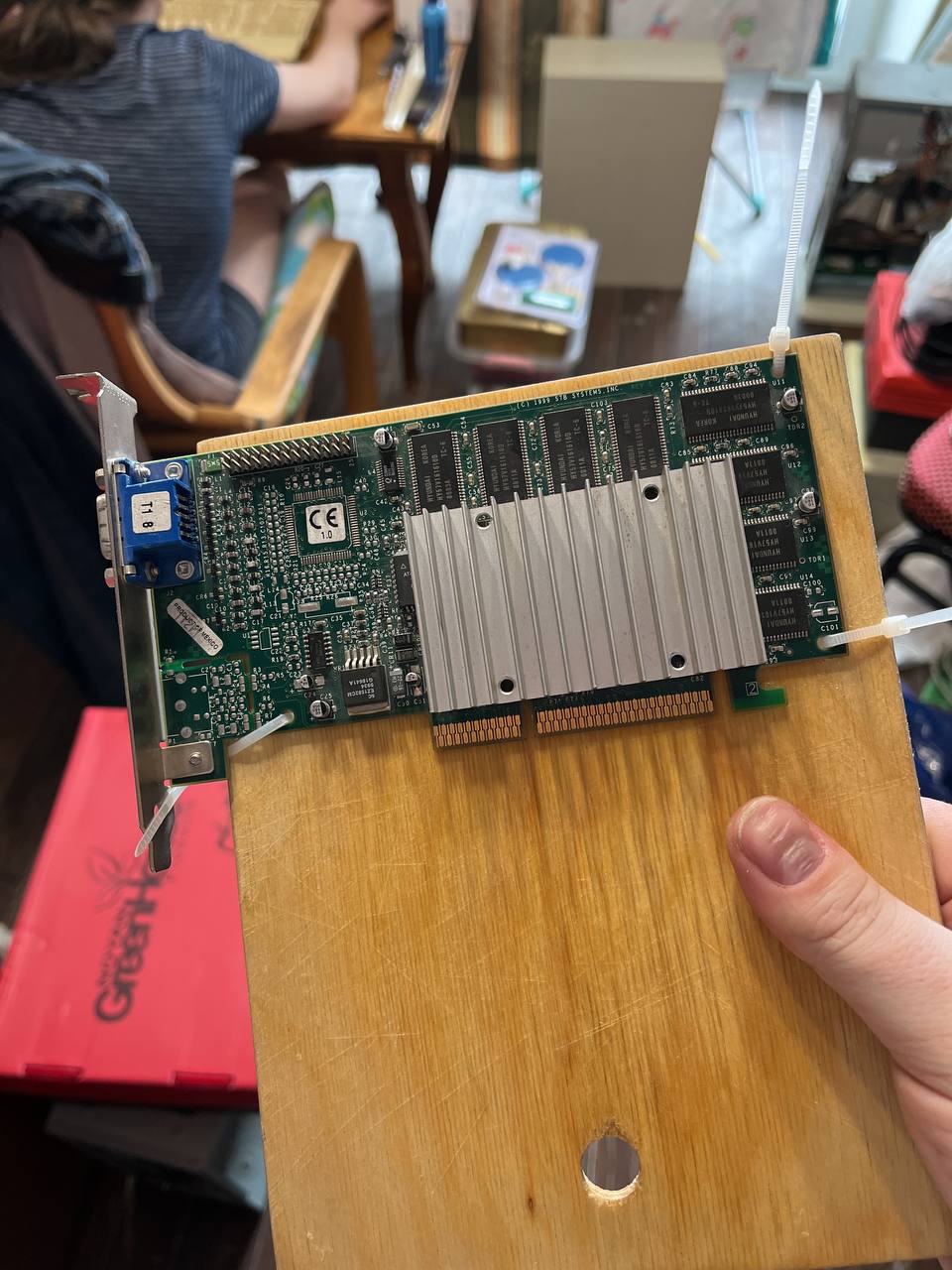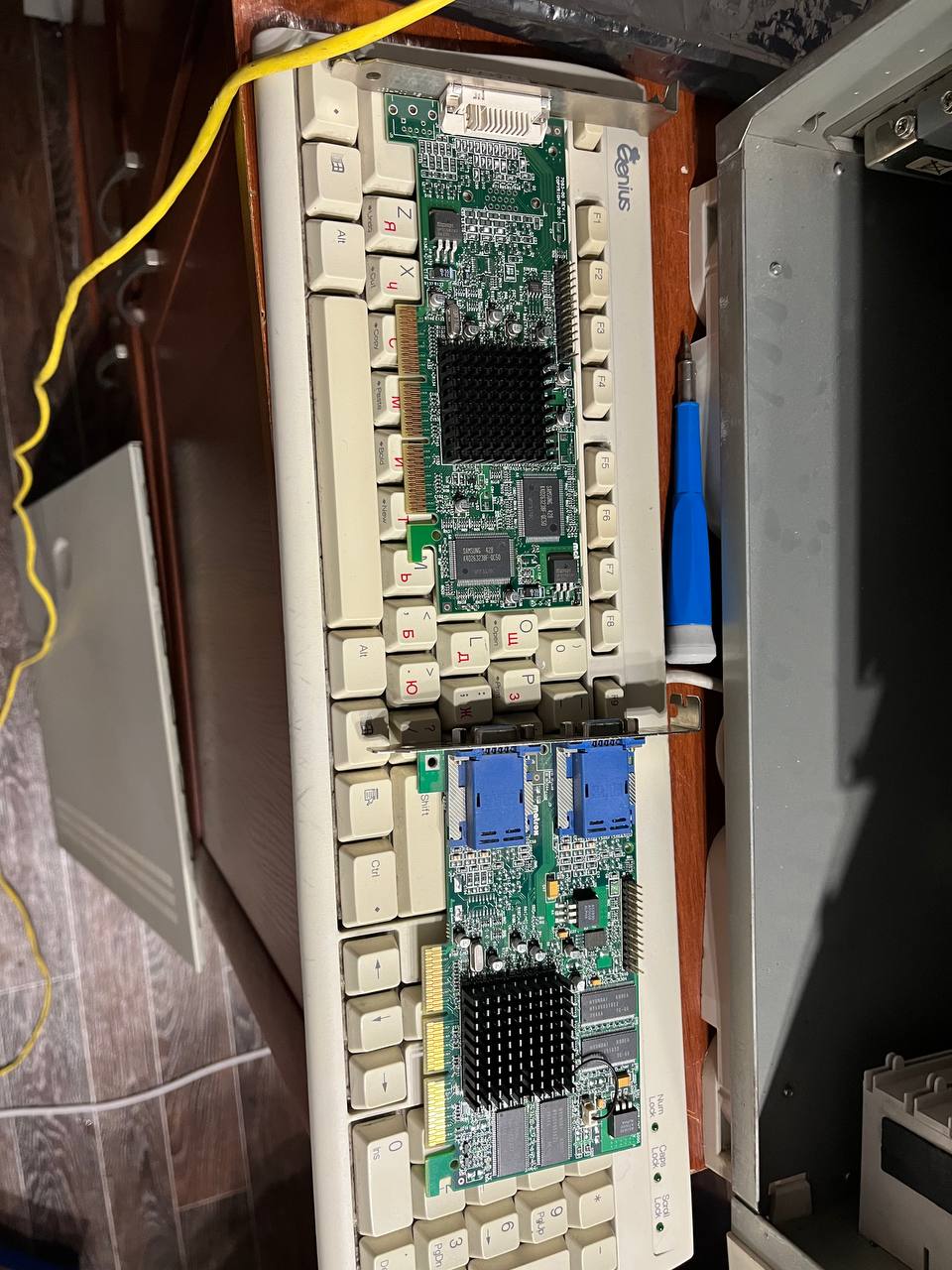 И последнее фото из вчерашних событий. Среди прочего мне достался необычный вариант Matrox G450 - с DVI и без прочих выходов. Для сравнения - классический "двухголовый" вариант.