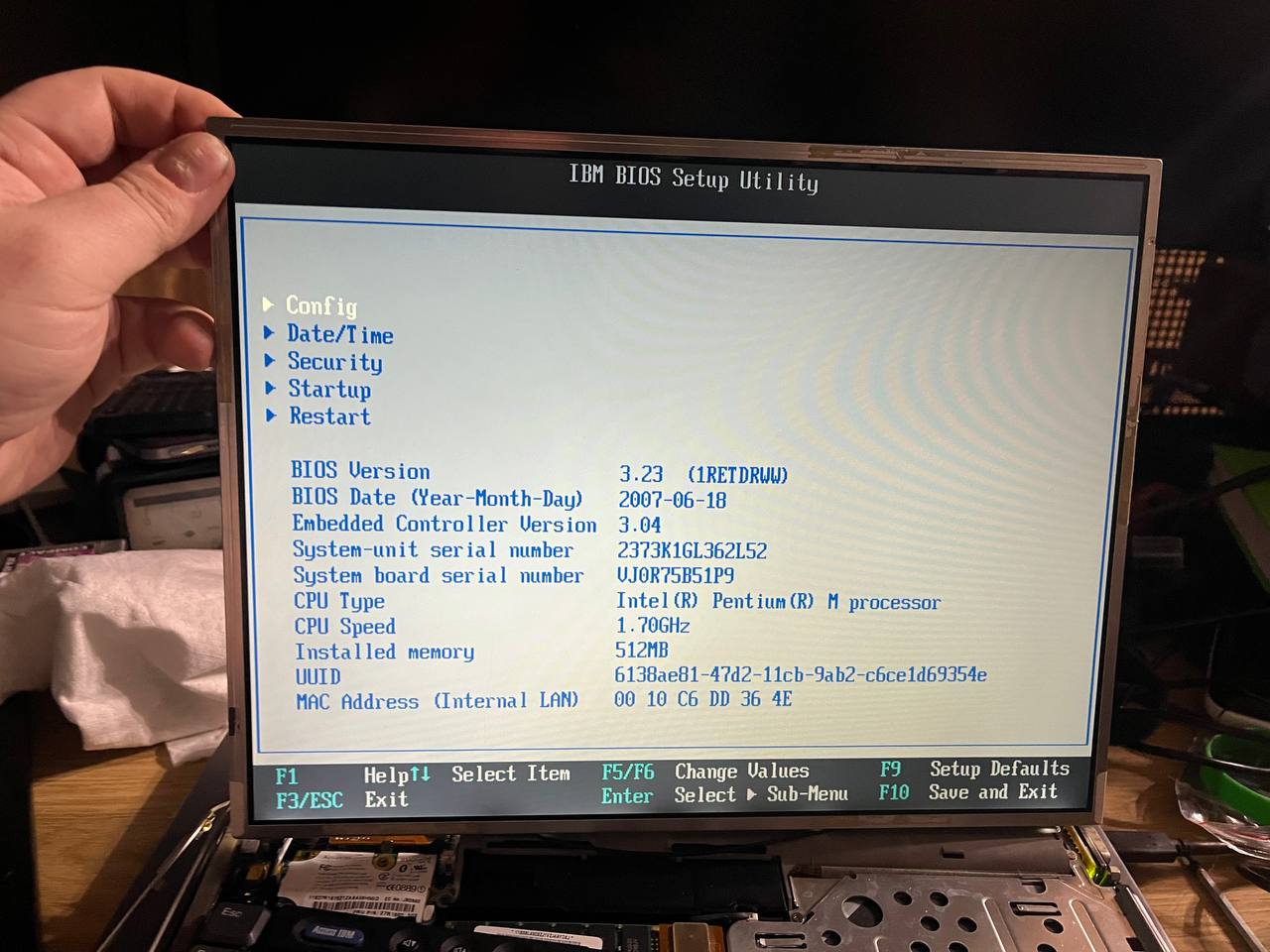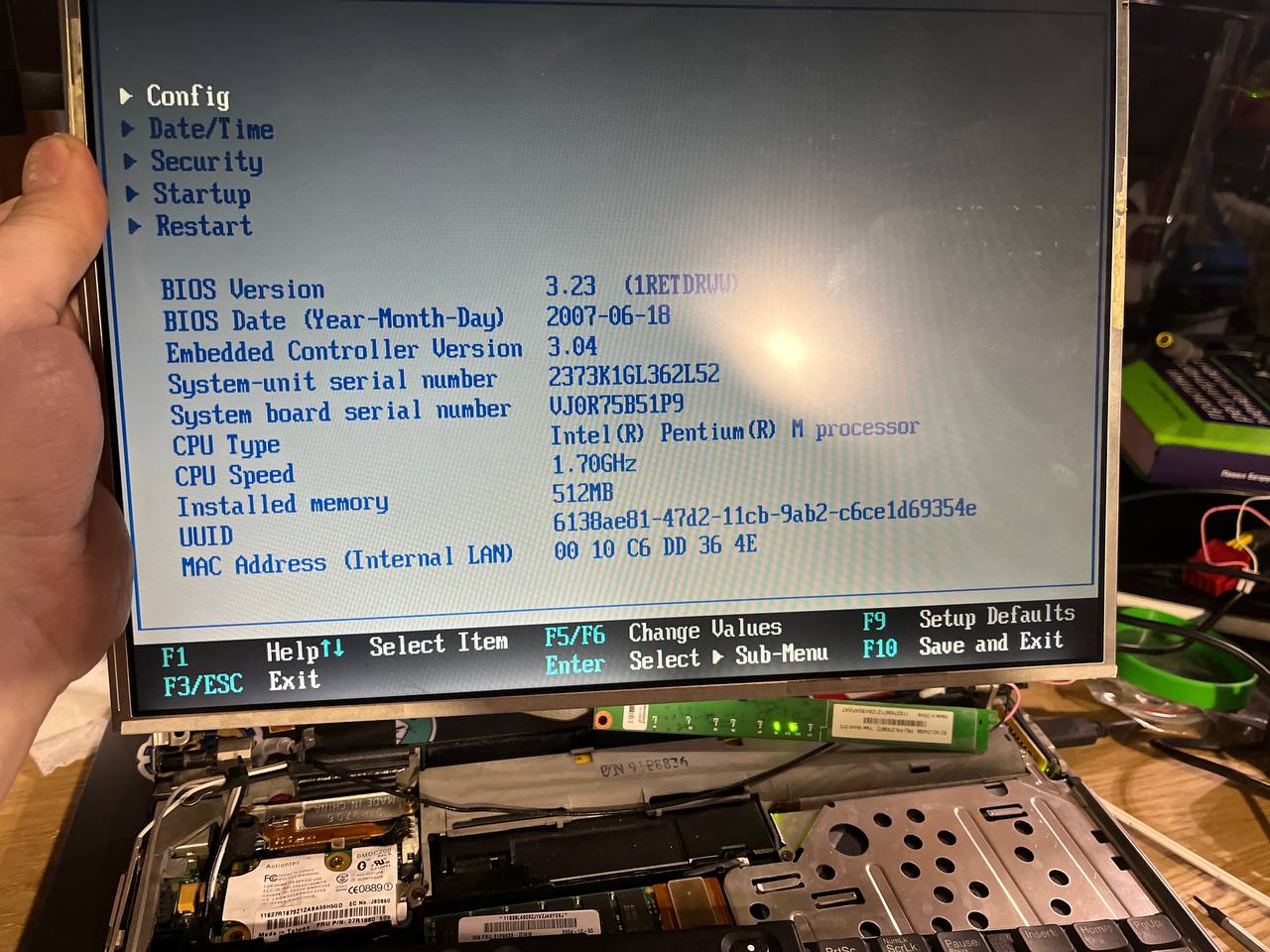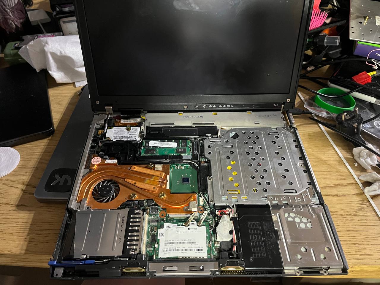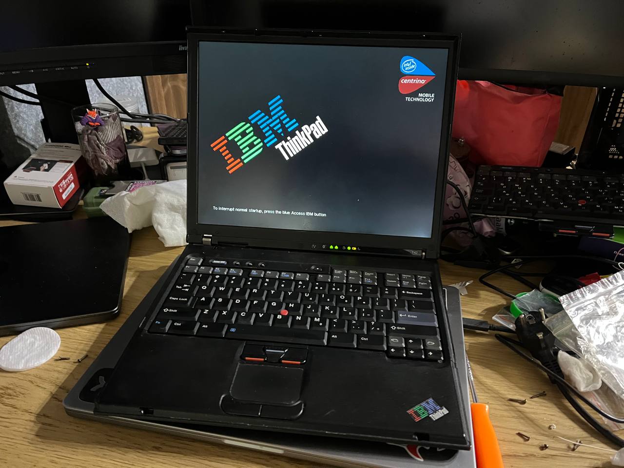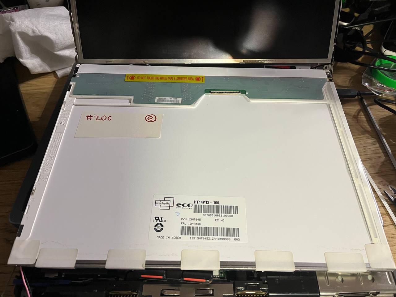 Продолжаем развлекаться с Финкпадами. Собрал из отдельных кусочков вкуснейший T42 c хайрез экраном (14" 1400х1050)! В этот раз прикол был не только в том, чтобы найти правильную из трех вариантов исполнения материнку (они шли с разными видео - Radeon 7500/9000/9600, здесь - топовый 9600), но и найти собственно матрицу. Бывшая в моих запасах крышка от Т43р оказалась с 1024х768 матрицей, к подаренной Русланом оригинальной (!) матрице не подошел ни один шлейф от 14" версии, хотя с 15" она отлично работает! В итоге, нашел в запасах матрицу со снятой лампой подсветки и чудом смог ее починить, правда со второго раза (после первого были жуткие засветы снизу - фото 5)! Такие приключения у меня в первый раз!
