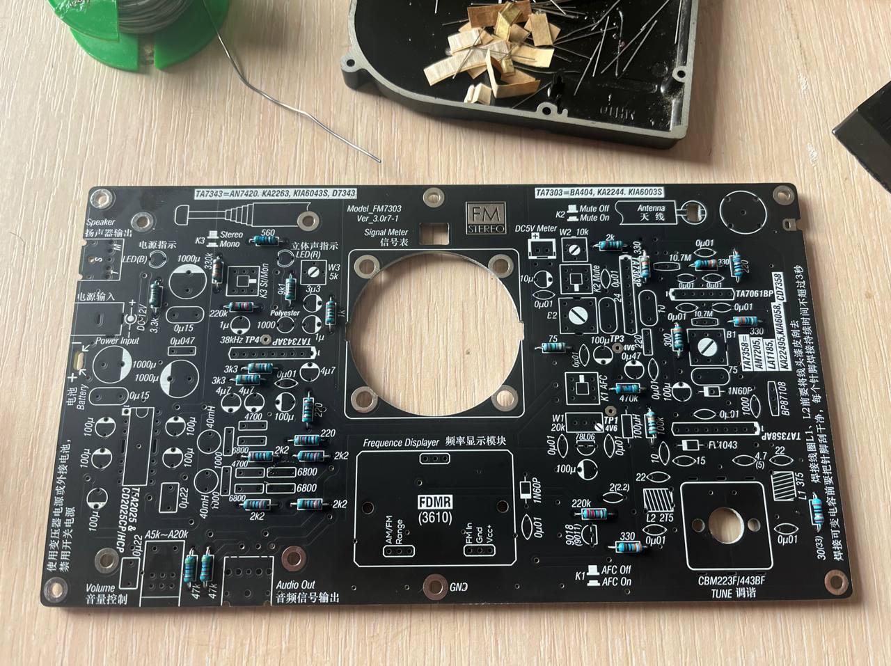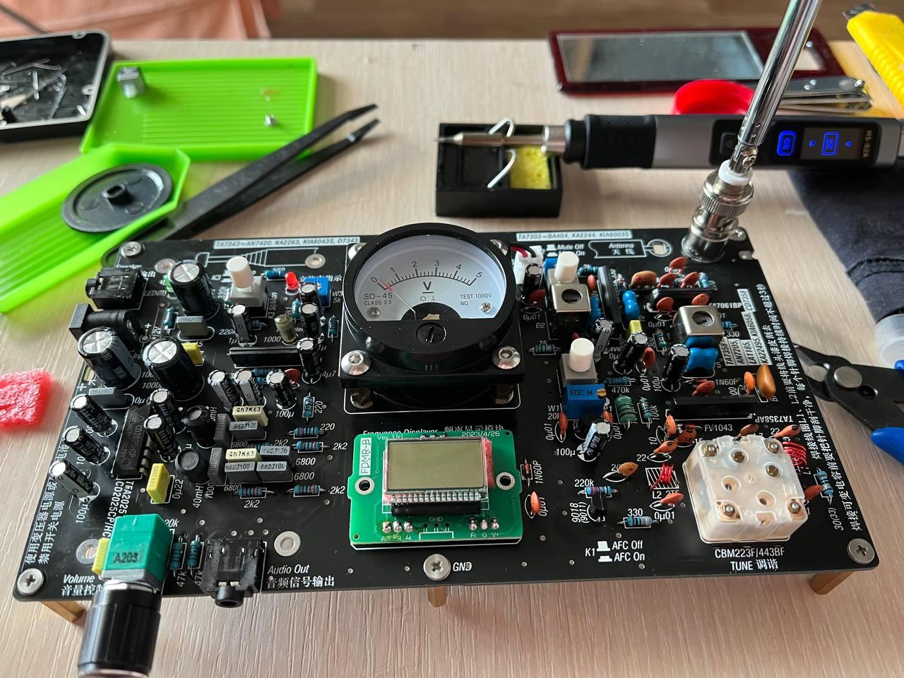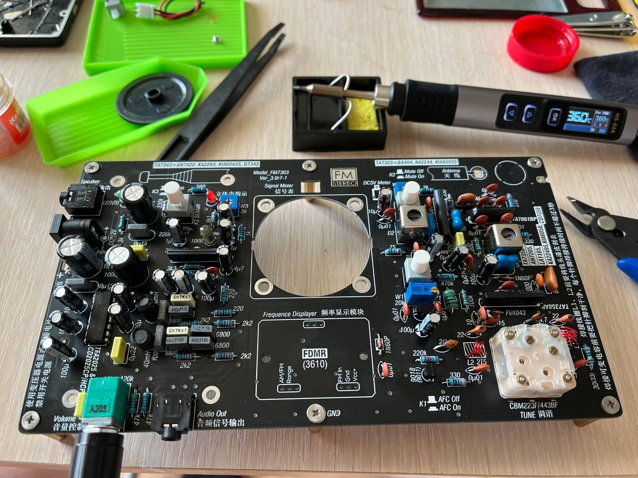 И в продолжении поднятой в чатике темы аналоговой техники. Собрал первый более-менее серьезный радиоконструктор - УКВ (FM) радиоприемник FM7303 от Radio_Lover. Чистый аналог, единственный цифровой компонент - частотомер, и тот вынесен на отдельную дочернюю платку. Настройка частоты с помощью спаренного конденсатора переменной емкости. Приемник - супергетеродинный, как положено. Даже с поддержкой стерео.