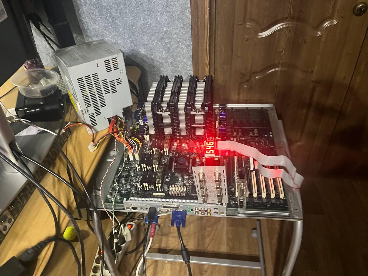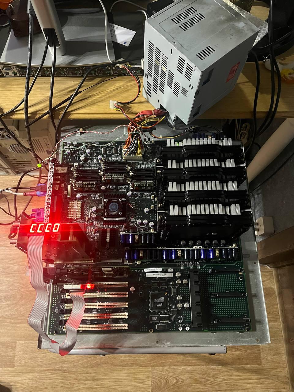 И вот, она работает! Осталось только победить память - первый банк работает исправно, а в других постоянно ругается, но я не понимаю точно, на какой из модулей (здесь в одном банке 6 планок шириной 48 бит!). Но это уже дело времени, а пока поработаем и с 512 Мбайт памяти. Хотя в запасе лежит еще целый гигабайт. Говоря об особенностях машины, важно упомянуть, что это чуть ли не единственная четырехпроцессорная рабочая станция на х86 процессорах. А от IBM PC она отличается родным для SGI загрузчиком ARCS и архитектурой памяти - видеосистема и процессоры делят общее пространство памяти (и физическую память) - как у современных Маков на ARM процессорах. А работает это чудо, внезапно, на Windows - NT 4.0 или 2000 с кастомными HAL и загрузчиком. P.S. Корпус еще не отмыт - потом сделаю фото в сборе и с установленной ОС