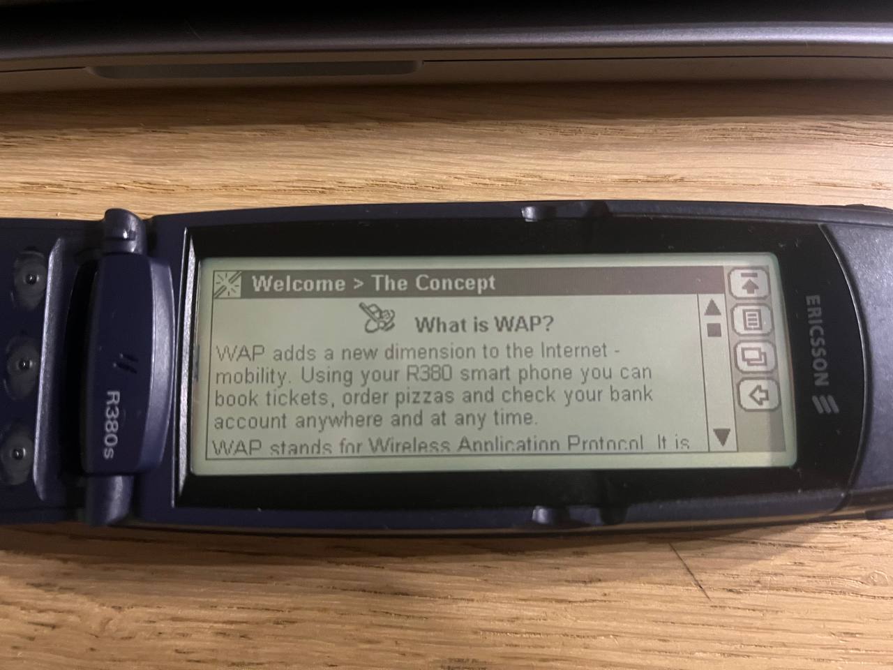 А ведь у Эрикссона были во истину уникальные решения. Чего стоят первые защищенные телефоны - R250s Pro и R310. Или, например, первый смартфон - R380s. Сегодня он перед вами. Вы скажете, Nokia 9000 был раньше или даже вспомните IBM Simon. Но есть нюанс - именно R380s был первым девайсом в истории, обозначенный этим словом. Дизайн - на первый взгляд, тот же самый R320s. Но наметанный взгляд заметит, что и корпус потолще и форма экрана несколько отличается и от R320s и от большинства телефонов вообще - он не совсем прямоугольный. А потом все становится понятно - это телефон с откидной панелькой, флипом. Только здесь флип не закрывает клавиатуру - она на нем размещена. Под флипом - экран, обычный, прямоугольный. 360x120 пикселей, черно-белый, поддерживает 4 оттенка серого. Он сенсорный (через сенсор же и передаются нажатия на клавиатуру). В режиме телефона (а в отличии от коммуникаторов Nokia - здесь под капотом не два девайса, а все же один - под управлением EPOC32, будущей Symbian) меню довольно куцее. А в режиме органайзера...ну в общем-то тоже. Телефонная книга, календарь, почтовый клиент, браузер. Калькулятор, будильник, блокнот для записей, одна игра. 1.2 Мбайт памяти доступно пользователю для писем, заметок и сохраненных страничек WAP. Самое обидное - нельзя установить свои приложения. Сегодня кажется немного, а тогда, осенью 2000 - это был огромный прорыв...
