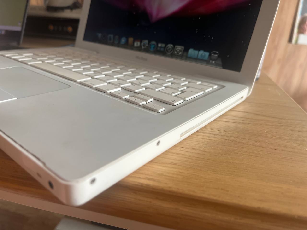 Пойдем дальше по фруктовой роще. Эта машина выпущена полтора года спустя, но по всем характеристикам она уступает девайсу из предыдущего поста (разве что памяти тут можно поставить до 4 ГБайт благодаря чипсету i965). Да и выглядит ноут заметно скромнее - корпус из пластика, меньше разъемов для подключения внешних устройств, заметно ниже разрешение экрана (1280х800) - все в нем выдает бюджетную модель. Собственно, так оно и есть - просто MacBook, так же известный как "белый Макбук" - самая младшая модель, входной билет в мир Apple в 2006-2010 годах. Минимальная конфигурация стоила тогда 999 убитых енотов - сейчас эту позицию занимает куда более интересно сделанный MacBook Air, тогда же пластиковый корпус не был чем-то ущербным - напротив MacBook Pro казались сверхпремиальными с их полностью металлическими корпусами.